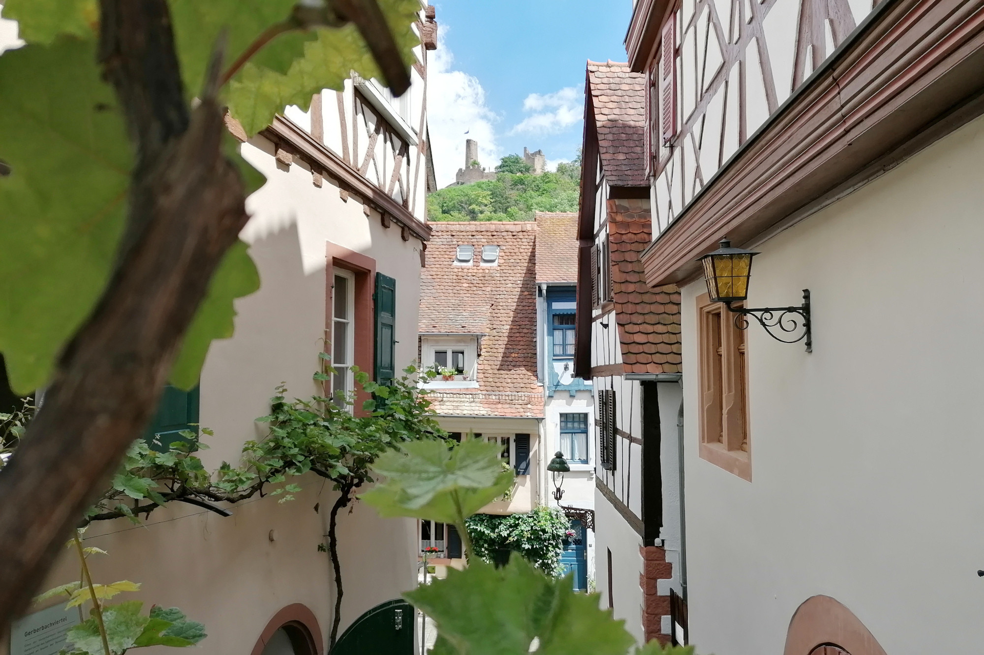 Zwischen Fachwerkhäusern kann man im Hintergrund weit oben die Burgruine sehen. | © Jasmin Wolf