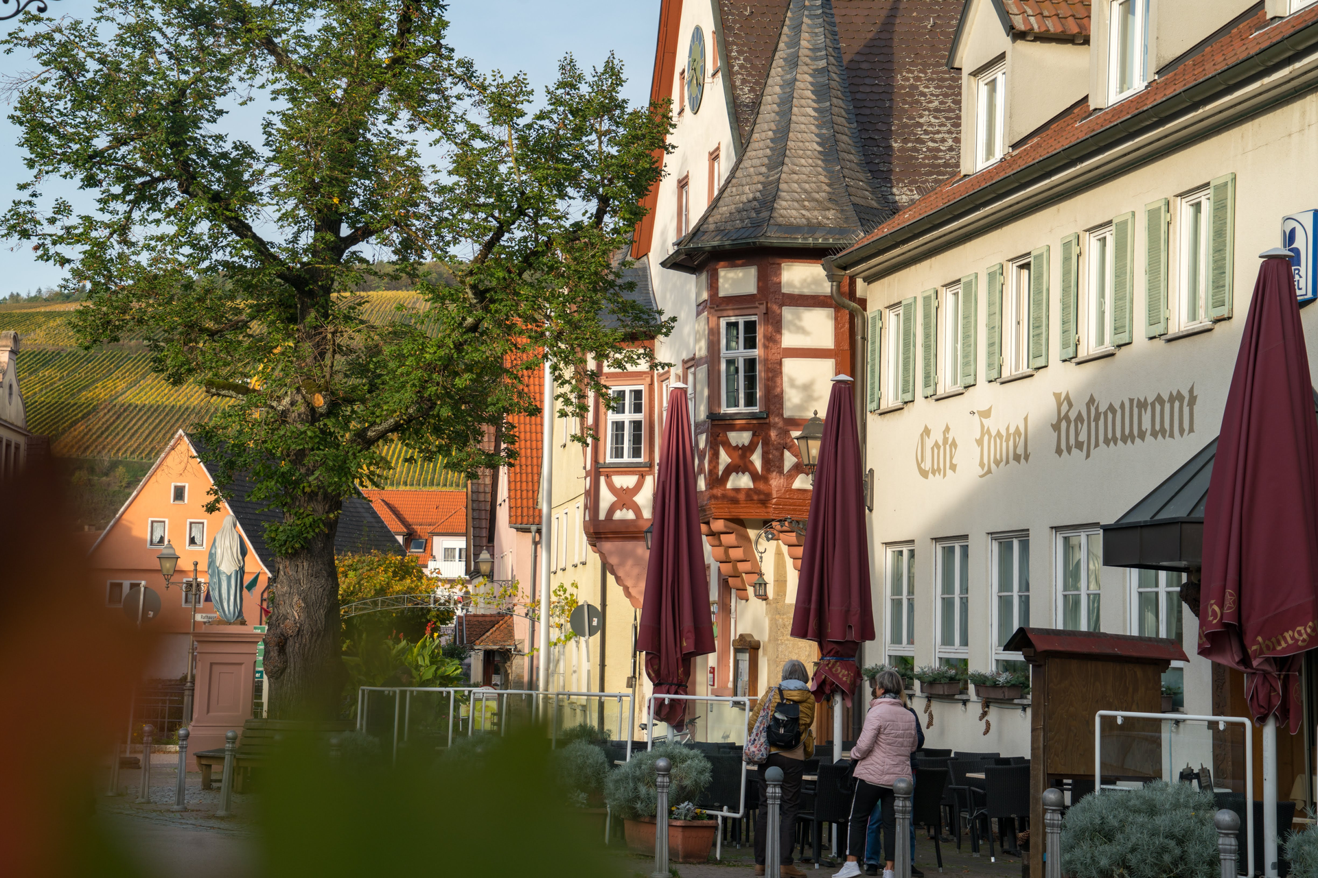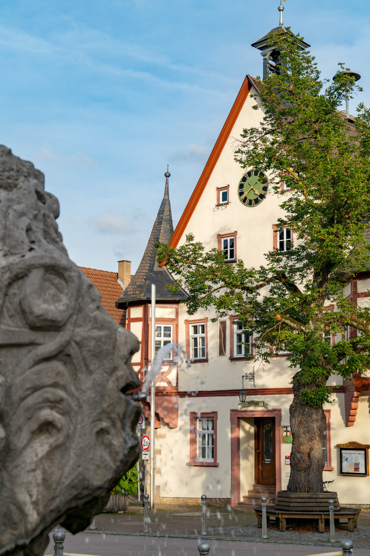 Wir starten unsere Wanderung auf dem großen Parkplatz unweit der Tauberbrücke in Markelsheim und begeben uns in die Ortsmitte dieses idyllischen Wein- und staatlich anerkannten Erholungsortes. Zentraler Punkt von Markelsheim ist der Marktplatz mit dem historischen Rathaus. Seine fränkischen Fachwerkerker und das steinerne Gemeindewappen zeugen von einer langen Tradition.