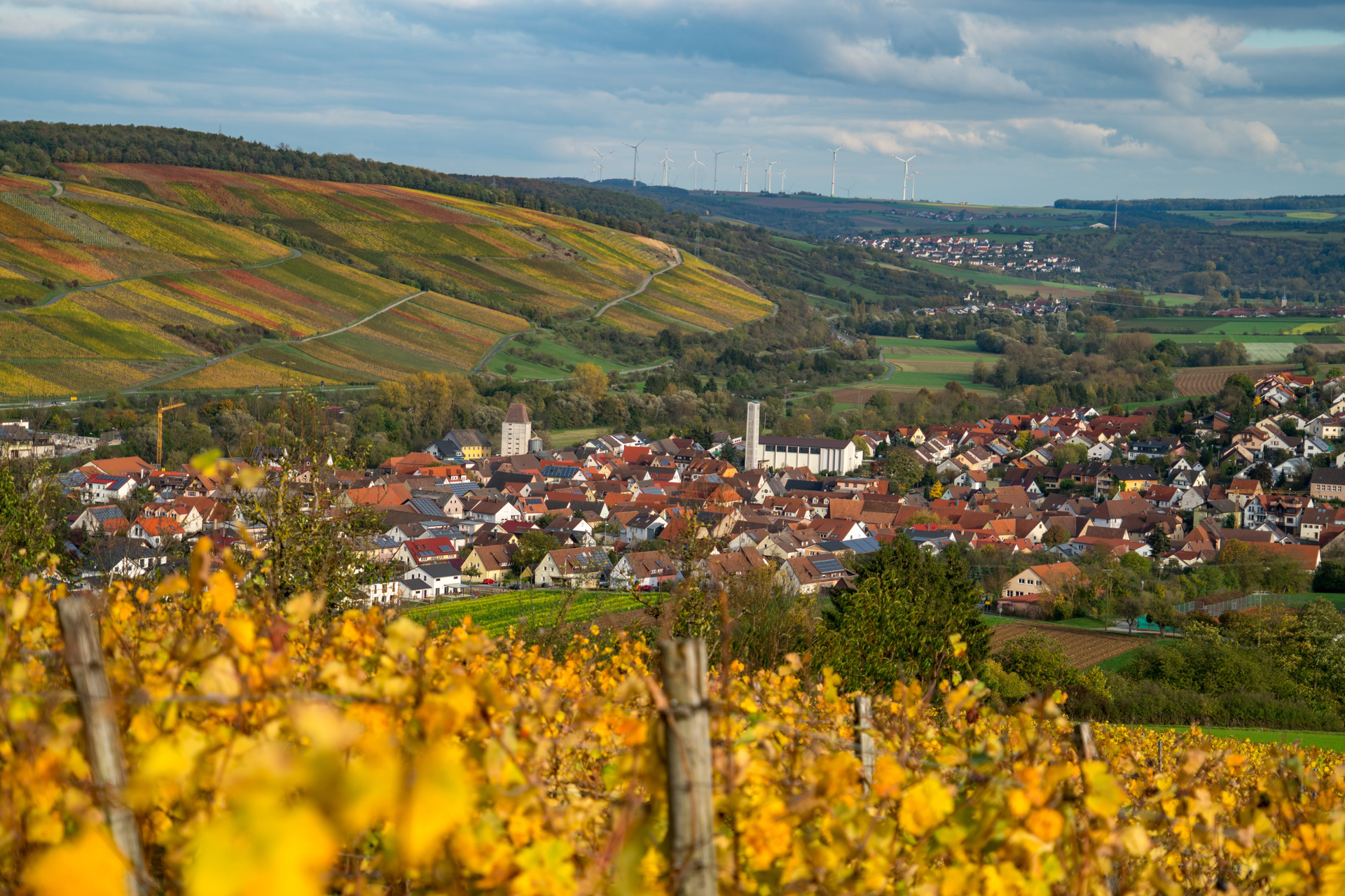 Wir gehen am Marktplatz weiter geradeaus und folgen der Hauptstraße bis zum Markelsheimer Friedhof. Dort wenden wir uns nach rechts und wandern auf der Apfelbacher Straße, die uns zum Weinlehrpfad führt. Wir folgen diesem Weg bergauf, überqueren eine Landstraße und wandern weiter geradeaus an Bäumen und Feldern vorbei zu einer schön gelegenen Sitzbank.