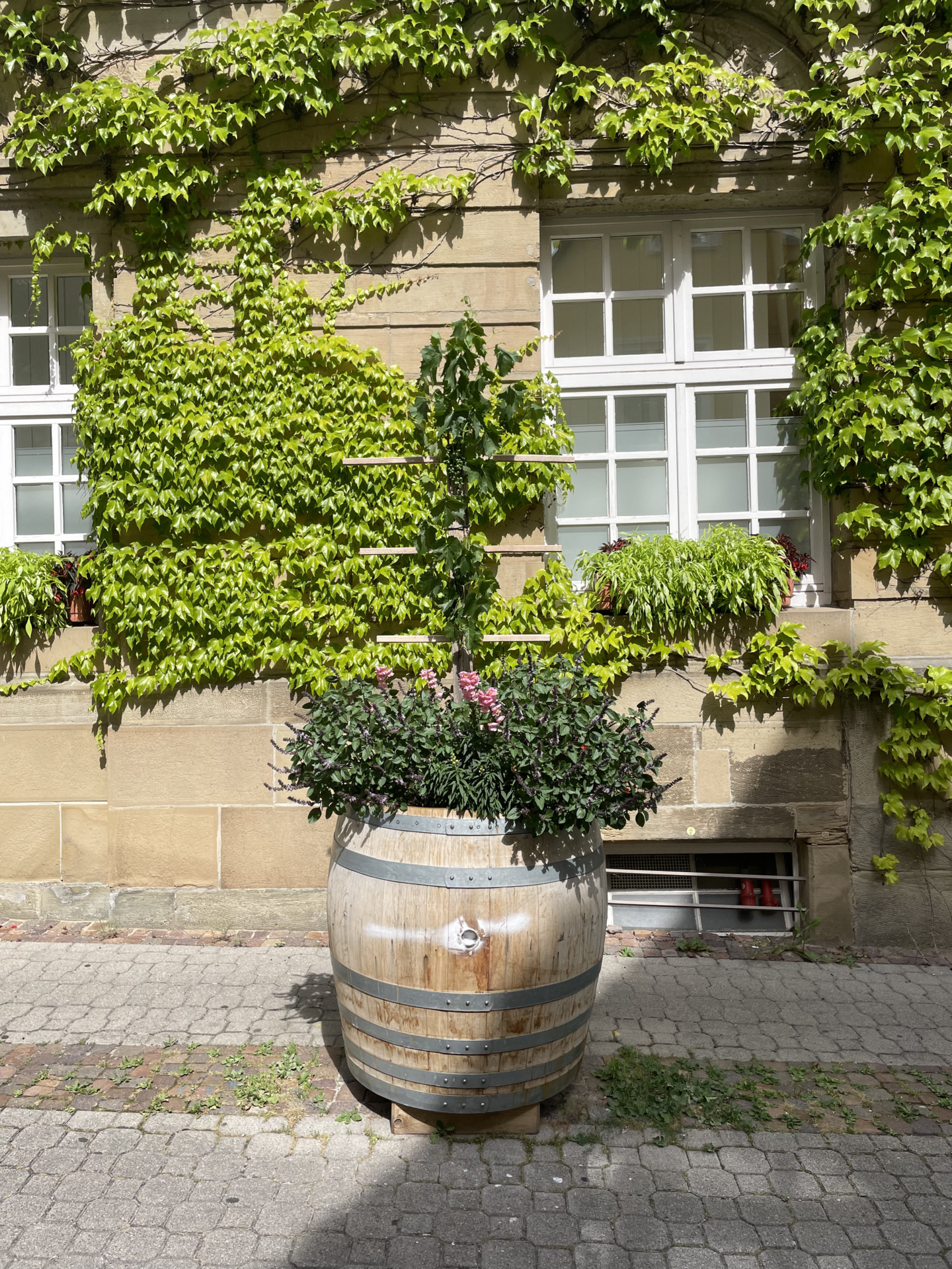 In der Innenstadt Brackenheims finden sich immer wieder schön hergerichtete Weinreben, gepflanzt in originalen Weinfässern.