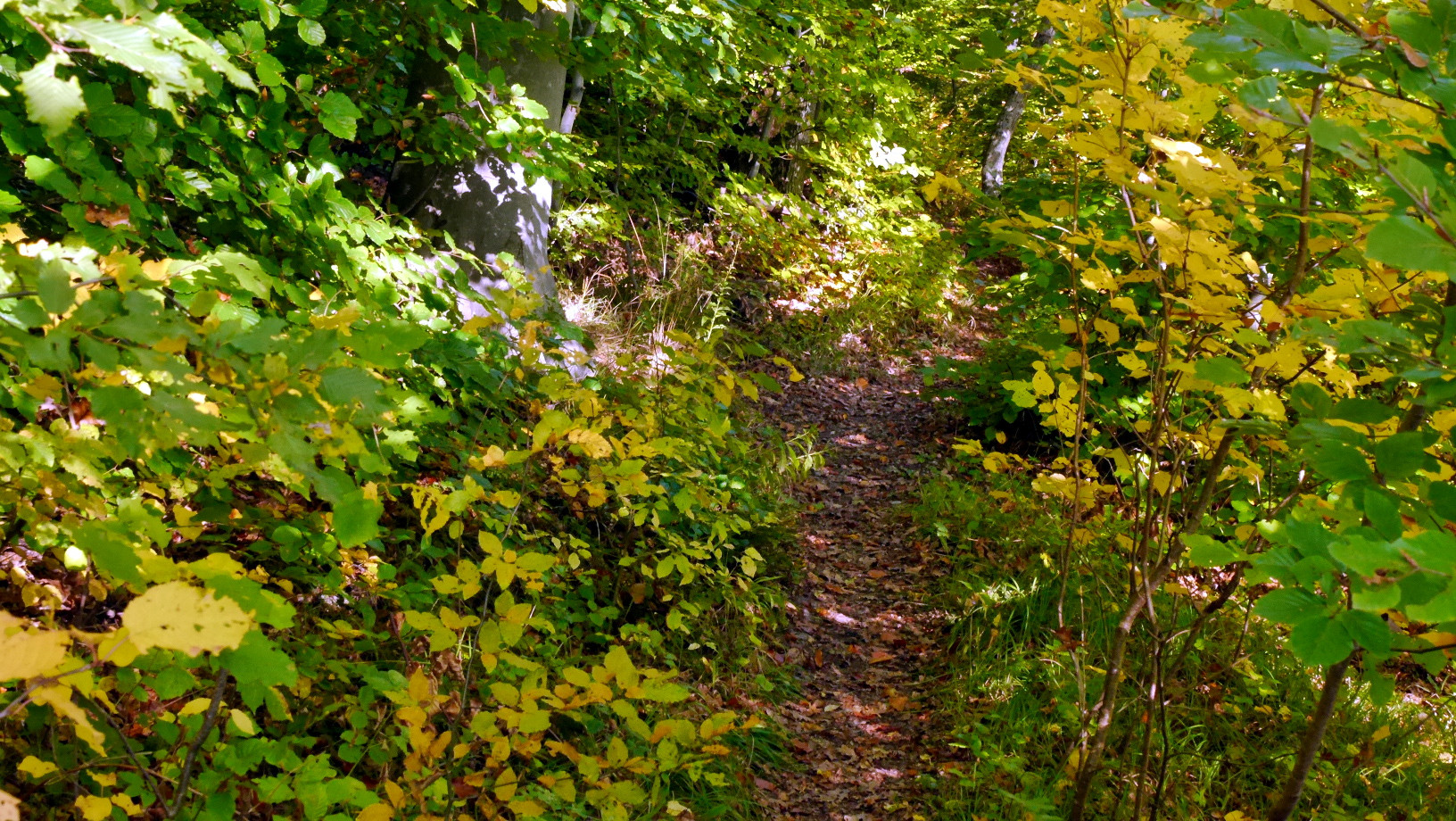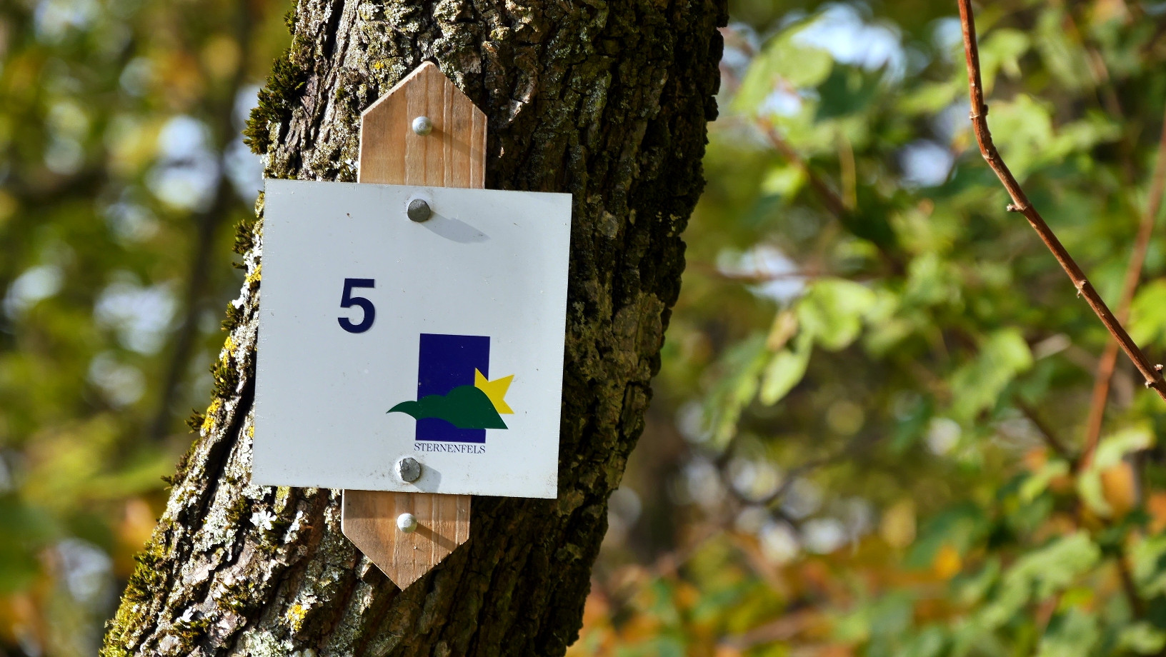 Vom Wanderparkplatz Eichendorffstraße bei den Weinbergen unterhalb des Schloßberges auf der Eichendorffstraße am Waldrand entlang, mit Aussicht über Sternenfels und über den Kraichgau zu den Rebanlagen am Sandberg. Gleich am Anfang der Weinberge steht noch aus alter Zeit ein mit Standsteinen massiv gemauertes Wengertschützen-Häusle. Weiter durch die Weinberge mit Blick auf die Sternenfelser Sportanlagen zur Landstraße nach Häfnerhaslach. Vor der Straße auf einem geschotterten Waldweg links bergan.