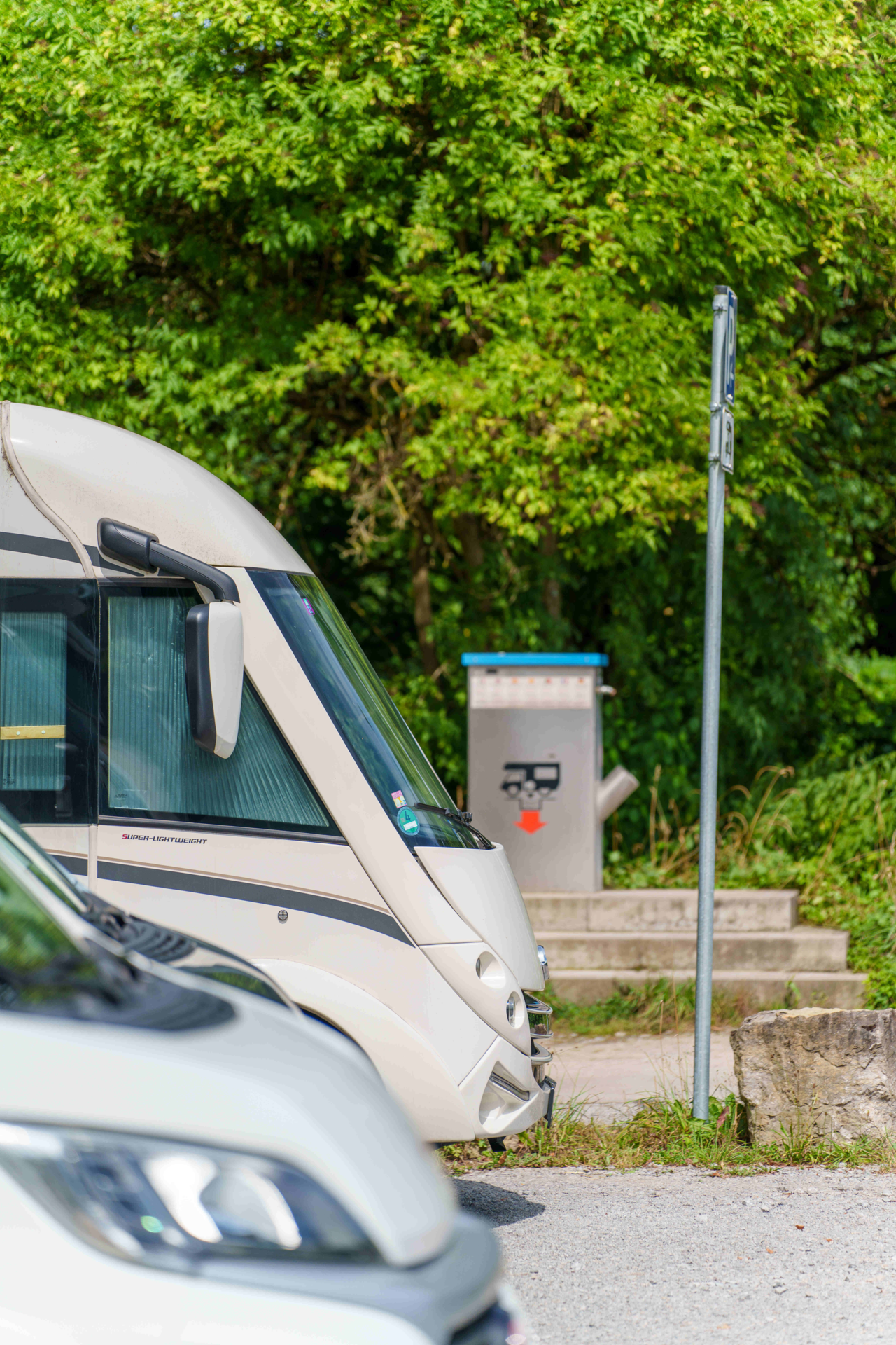 Ver- und Entsorgungsstation: Ver-und Entsorgungsstation mit Frischwasser + Münzeinwurf (100 l Frischwasser = 1,00 €). Zwei Stromzapfsäulen mit Münzeinwurf (1 kWh = 0,50 €).