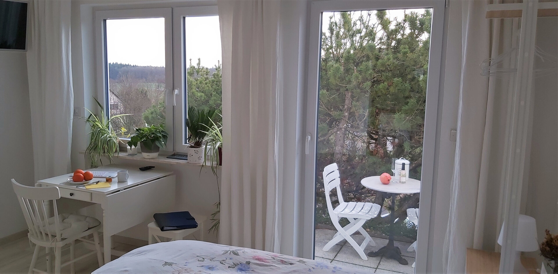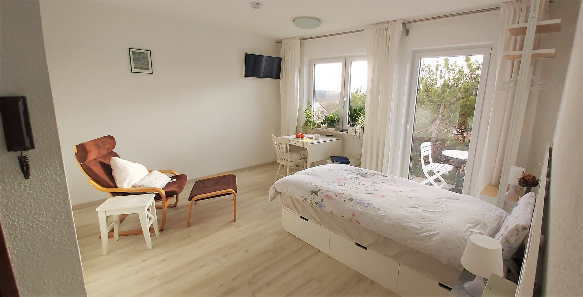 Das Apartment mit dem Eingangsflur und der kleinen Terrasse sind exklusive für den Gast reserviert.