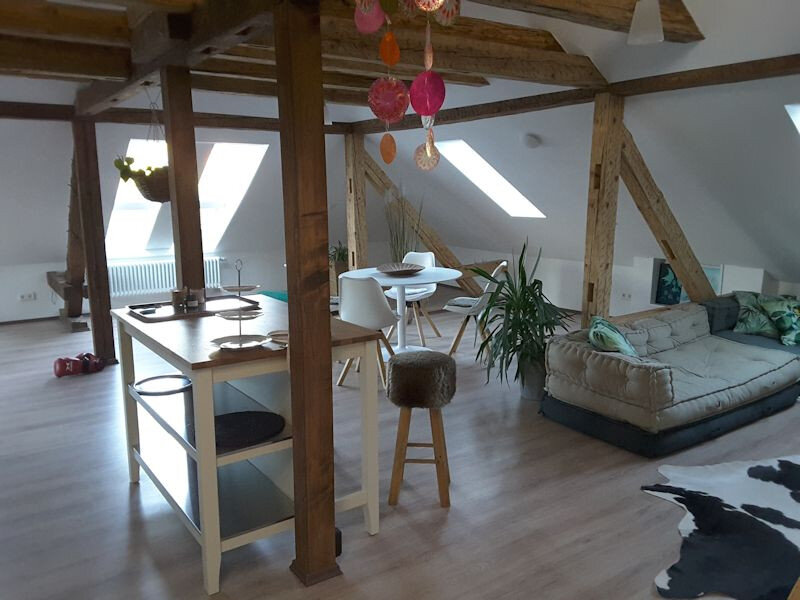 Mitten im Herzen von Schwäbisch Hall, ruhig gelegen in der charmanten Katharinenvorstadt, erwartet dich ein außergewöhnliches Loft direkt am Fluss Kocher und dem idyllischen Stadtpark. Hier, im modern ausgebauten Dachgeschoss einer Jugendstilvilla aus dem 19. Jahrhundert, findest du auf rund 65 qm genau den Raum, den du brauchst – zum Entspannen, Genießen, Arbeiten oder einfach zum Sein.