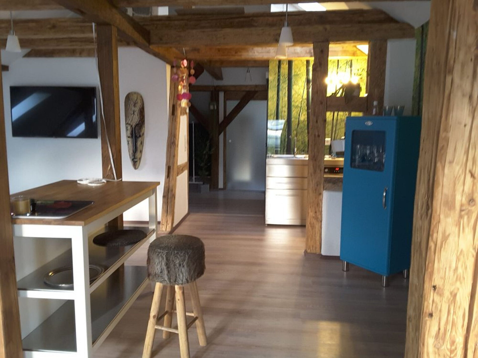 Das Loft empfängt dich mit einem offenen, lichtdurchfluteten Wohnkonzept und liebevoll gestalteten Bereichen zum Ankommen und Wohlfühlen. Lass dich in der gemütlichen Lounge-Ecke mit großem Flachbild-TV nieder, träume dich im Schlafbereich mit bequemem Futonbett in den Schlaf oder zieh dich mit einem guten Buch in eine der individuellen Sitzecken zurück. Bis zu 5 Personen können im offenen Bereich nächtigen.