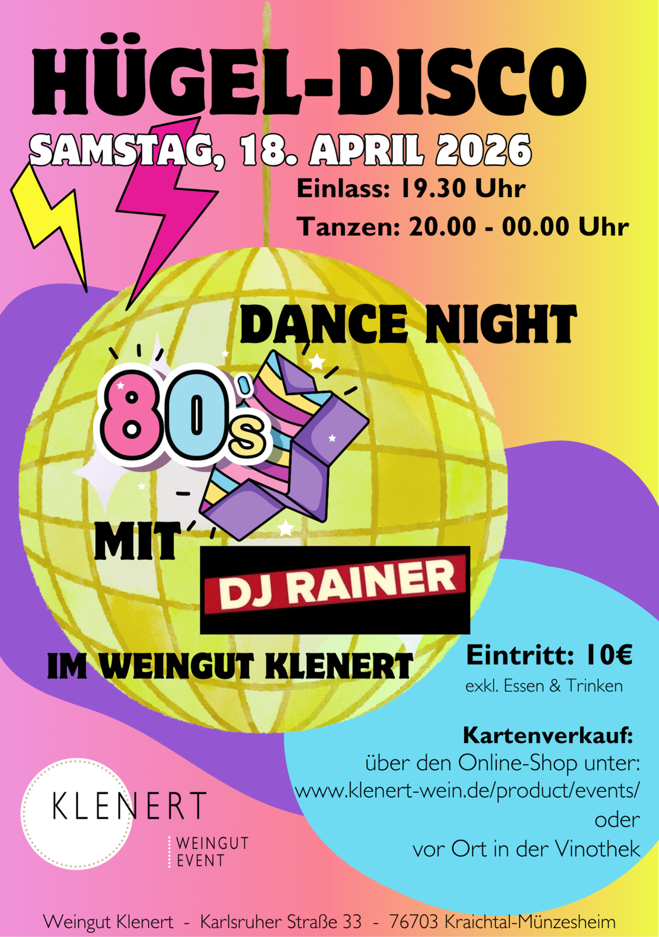 Freut euch auf die nächste Hügel-Disco / Dance Night im Weingut Klenert. Dieses Mal die 80er-Party mit DJ RAINER.