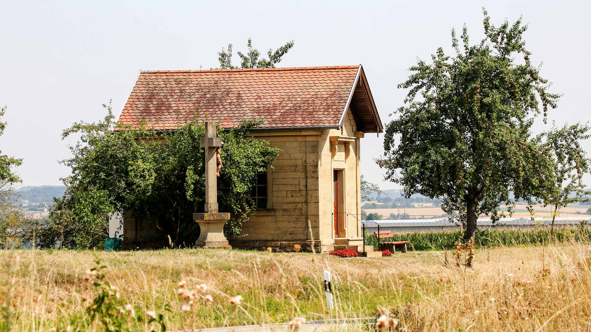 Weiter geht es bergab vorbei am Bauerbacher See bis zur Pferdekoppel, dort links über einen Schotterweg, der entlang von Streuobstwiesen mit jungem und altem Baumbestand führt. Der Weg steigt wieder an zur Bügelbergkapelle, die besonders schön liegt und einen Rundumblick über Bauerbach, Felder und Wiesen bietet.