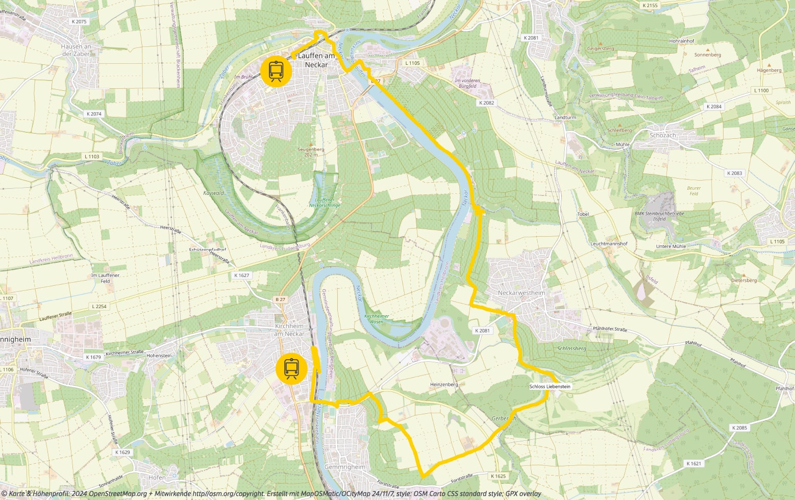 Vorbei an Regiswindiskirche und Rathausburg führt der Weg zum Neckar und direkt hinein in die Weinberge des Weinsüden Weinorts. Vom wildromantischen Herrrlesberg (Grillplatz) öffnet sich der Traumblick aufs Neckartal. Weitere Verweilstation auf dem Weg sind der Weinort Neckarwestheim und schließlich das imposante Schloss Liebenstein.
