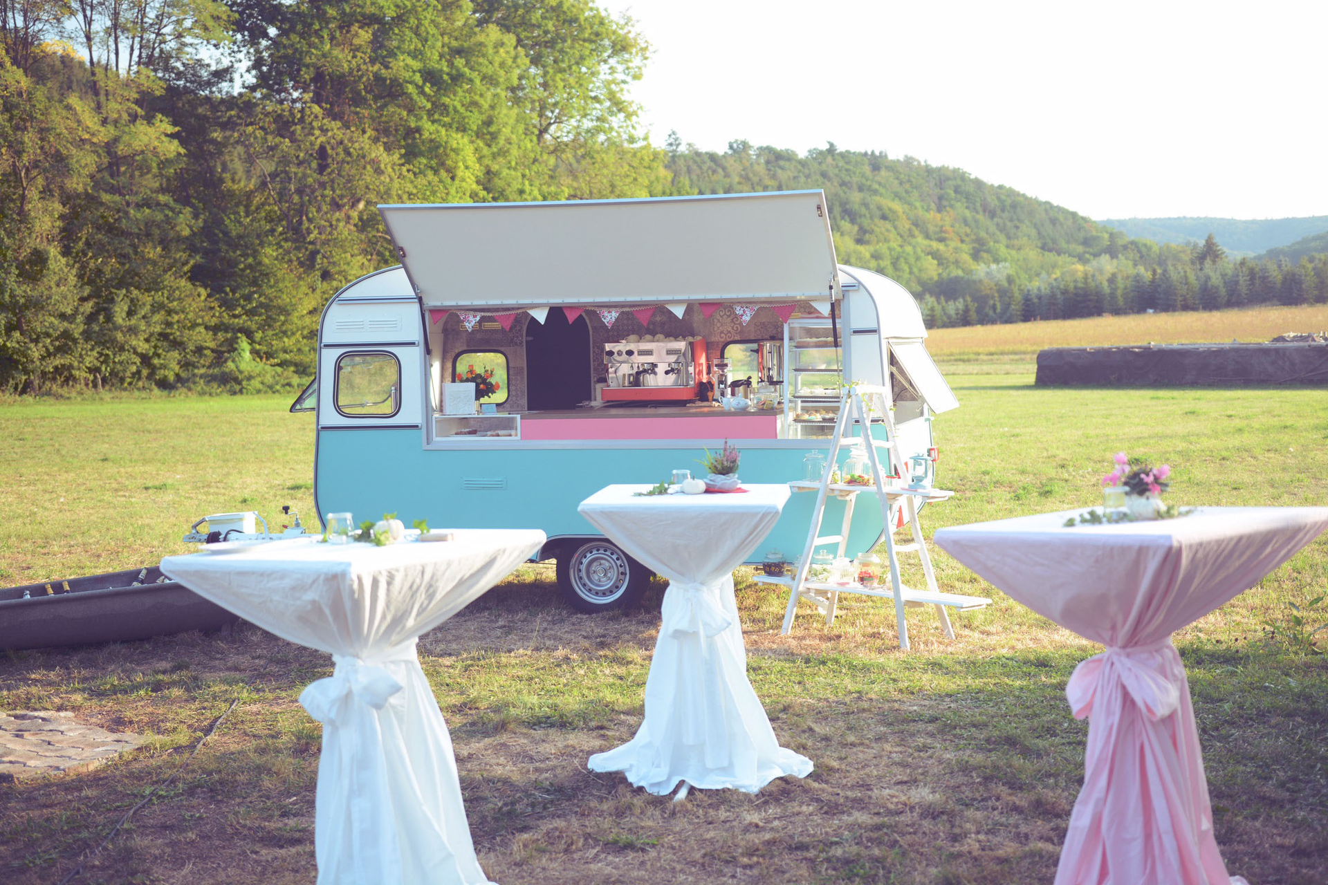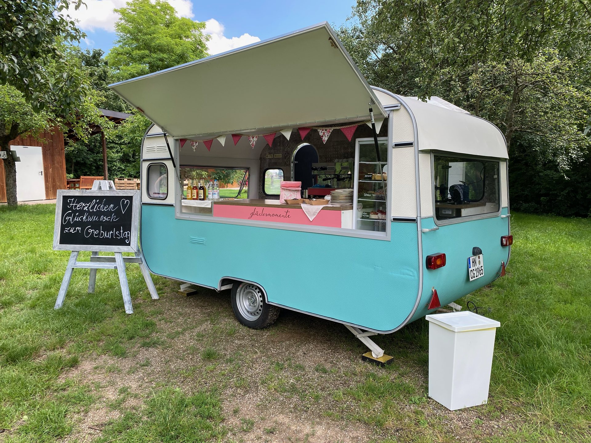 Das rollende Café Glücksmomente ist ein mobiles Café, welches aus einem alten Wohnwagen entstanden ist und für Catering gebcht werden kann.