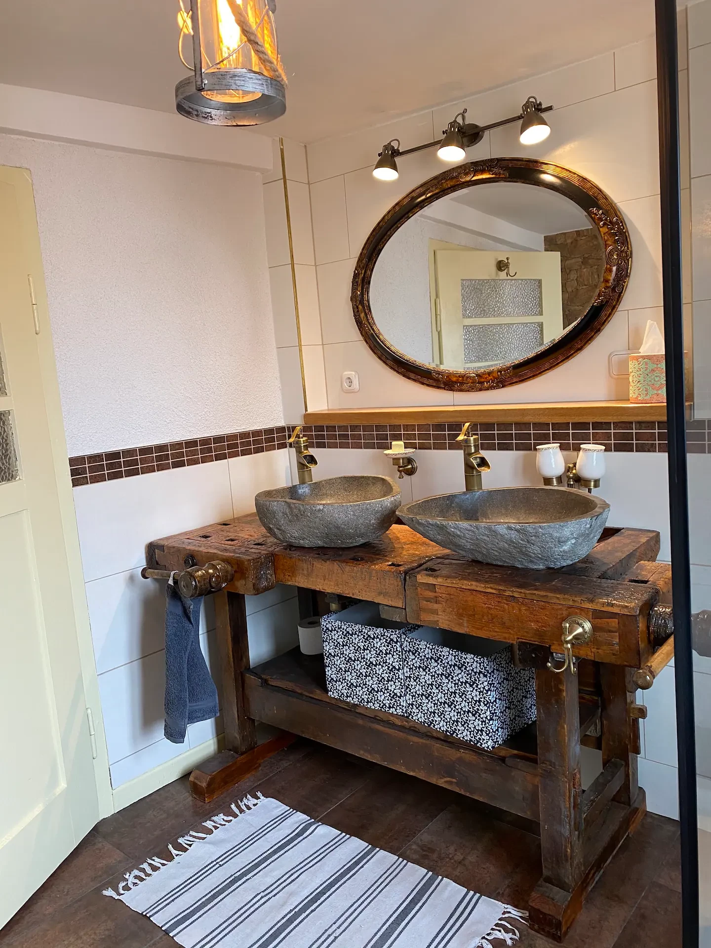 1 Badezimmer mit Doppelwaschtisch, Dusche und WC, 1 Großen Wohn- Essbereich mit Couch und offener Küche.