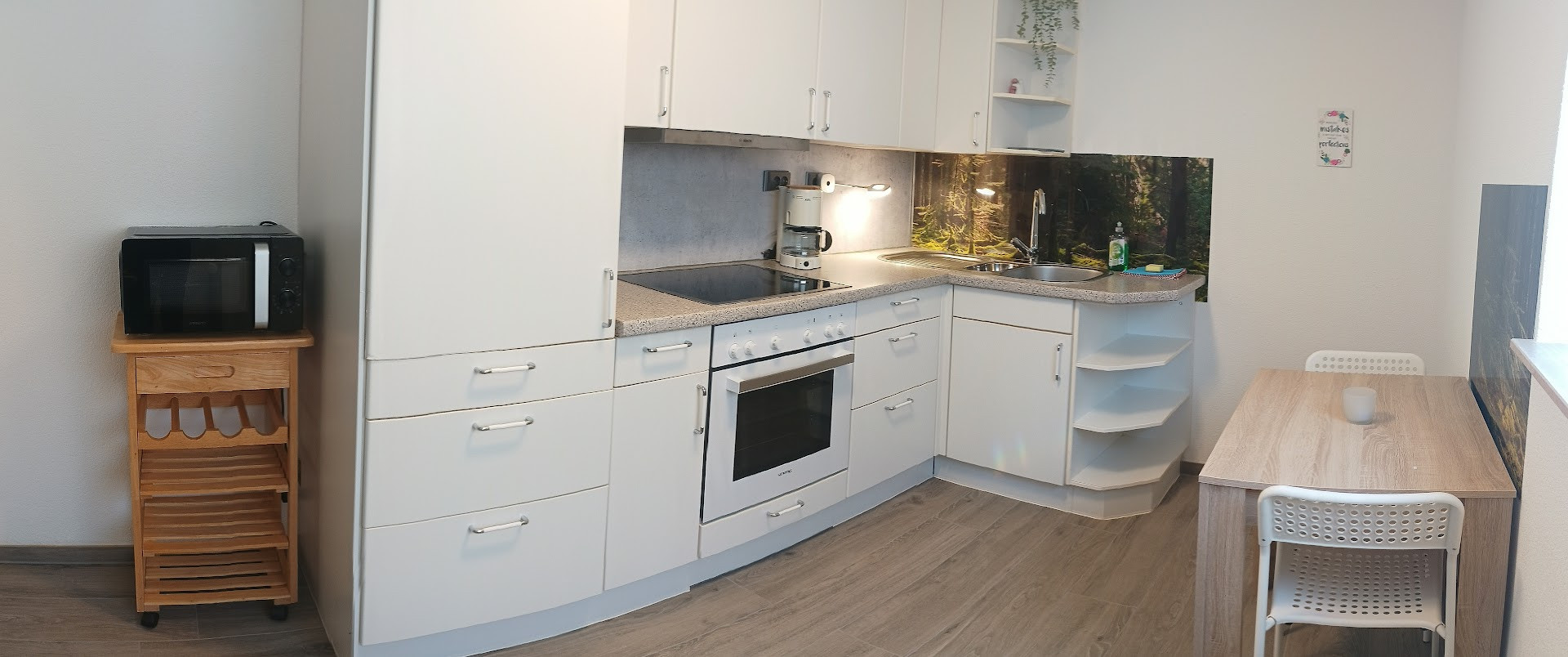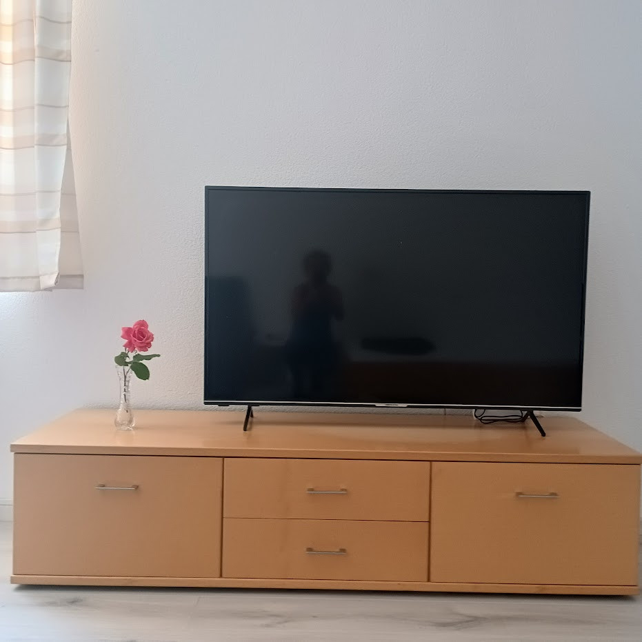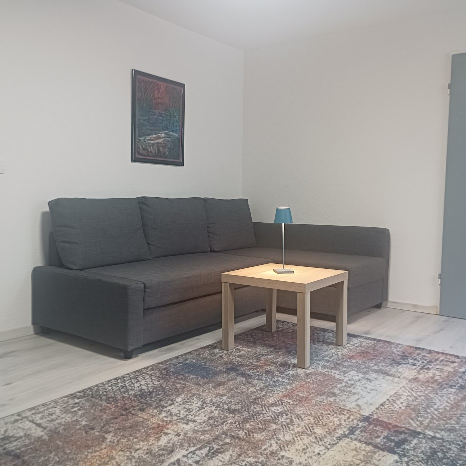 Ca. 46qm grosse Wohnung im UG (mit Tageslicht) mit kleinem Außenbereich, Küche (voll ausgestattet) mit Mikrowelle, Kühlschrank mit Gefrierfach, SENSEO Kaffeepadmaschine, Wasserkocher, Toaster, Esstisch, Wohn-Schlafraum mit 2 Einzelbetten und geräumiger Schlafcouch, großem TV, Bad/WC mit Fenster, Waschmaschine und Wäscheständer. Incl. Bettwäsche und Handtücher.