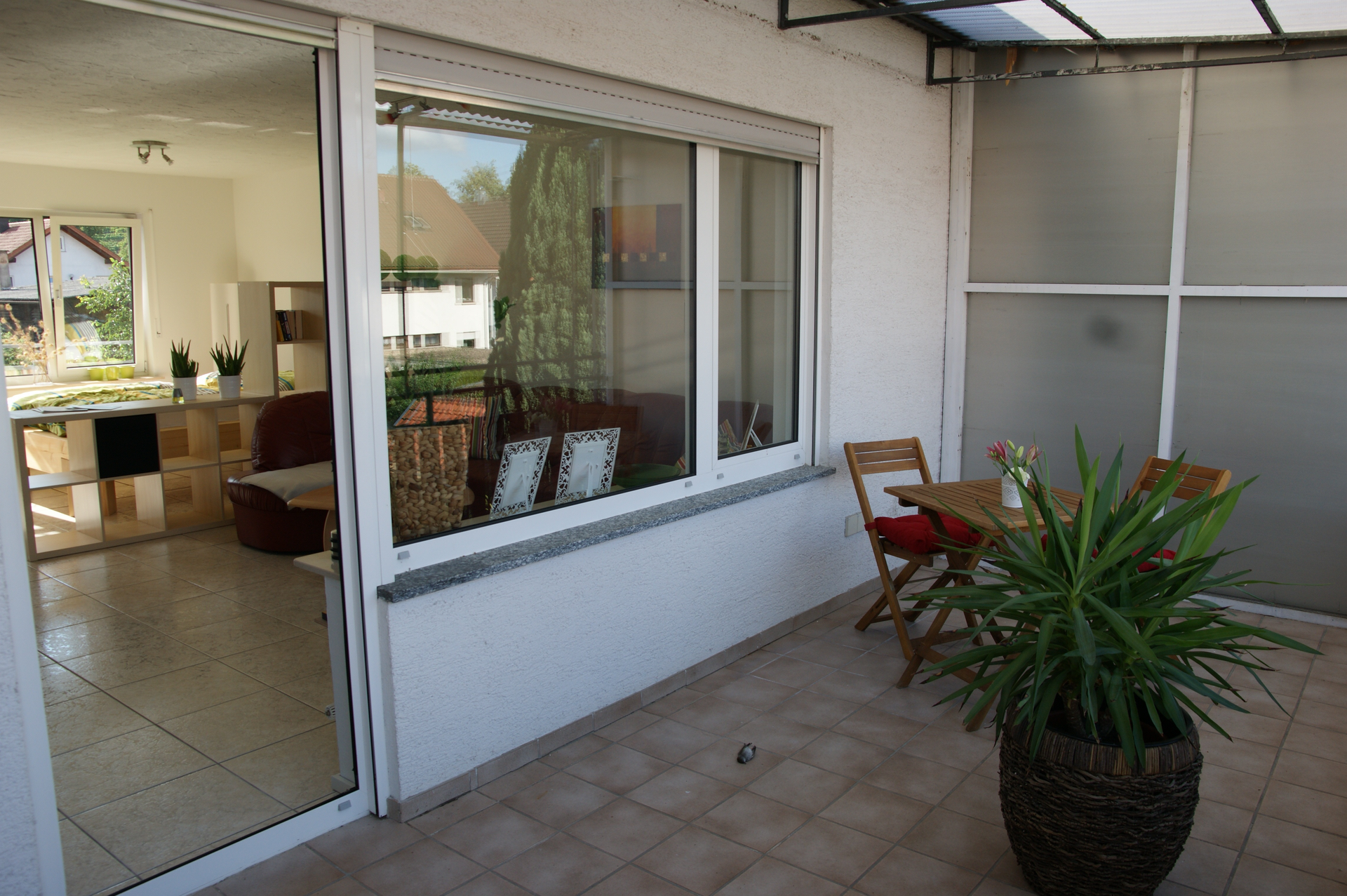 Helles und liebevoll eingerichtetes Einzimmerappartment (140 cm Bett, Küchenzeile, Wohn-/Essbereich, Dusche/WC, 2 Balkone) in Stadtnähe.
