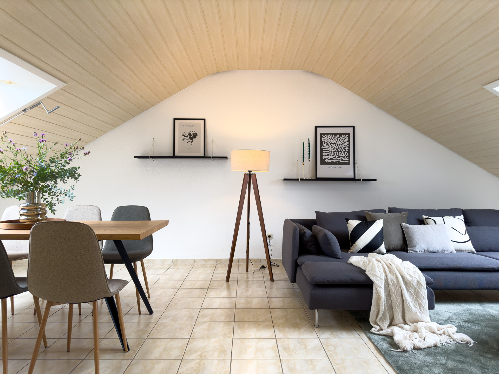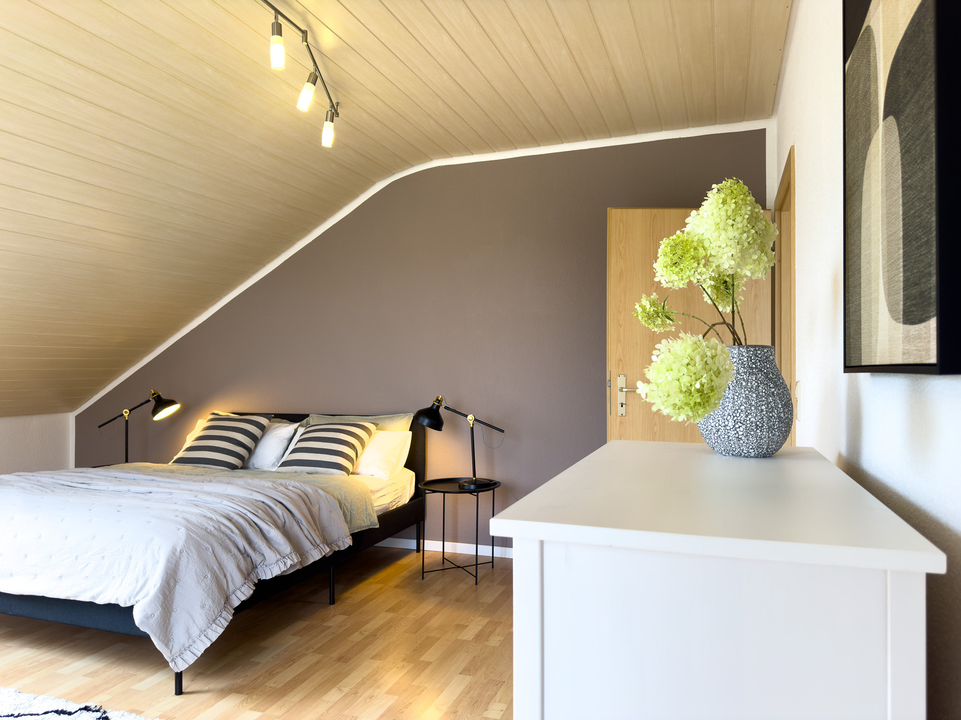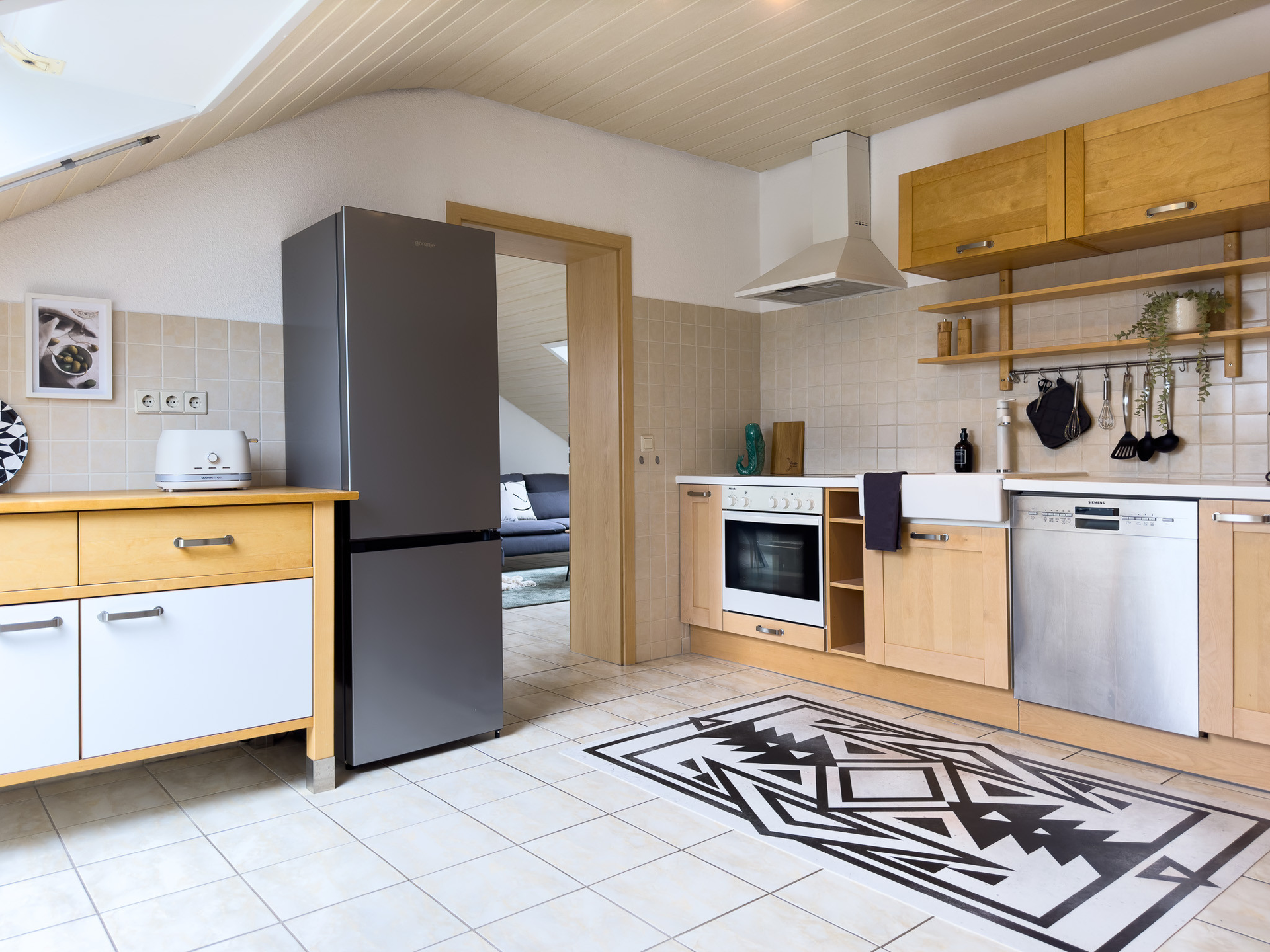 Die größere der beiden Ferienwohnungen befindet sich im Dachgeschoss. Zu den Zimmern zählen ein großes Schlafzimmer mit Doppelbett, ein Schlafzimmer mit zwei Einzelbetten sowie ein Einzelzimmer, welches auch als Kinderzimmer genutzt werden kann. Weiterhin gibt es ein großes Wohn- und Esszimmer mit TV und eine vollständig ausgestattete Küche sowie ein Badezimmer.