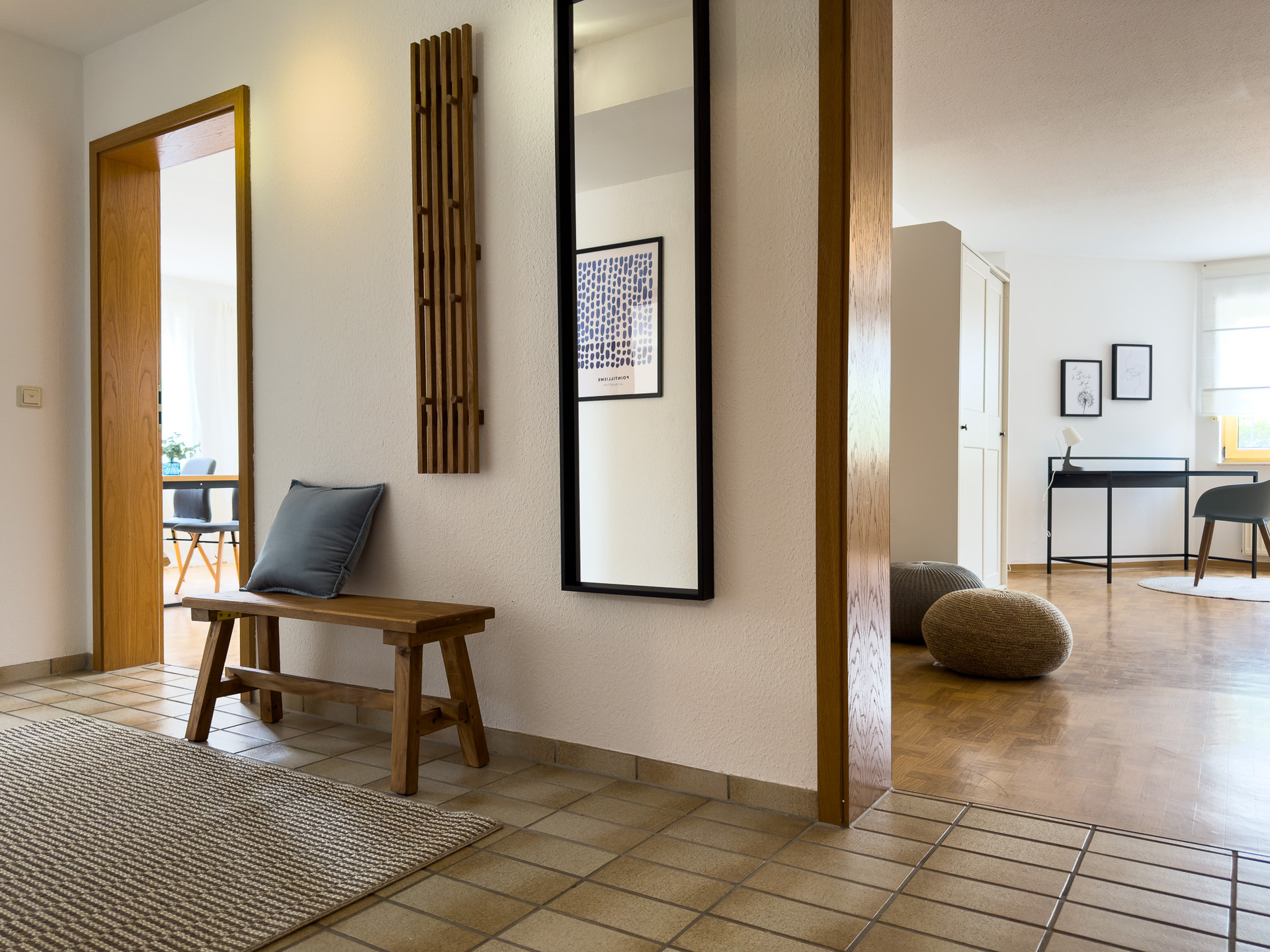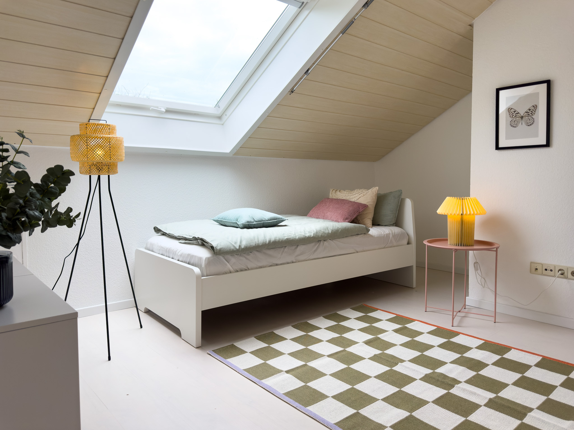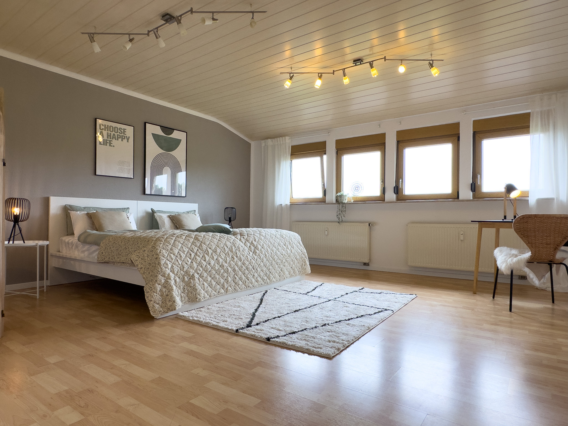 Die größere der beiden Ferienwohnungen befindet sich im Dachgeschoss. Zu den Zimmern zählen ein großes Schlafzimmer mit Doppelbett, ein Schlafzimmer mit zwei Einzelbetten sowie ein Einzelzimmer, welches auch als Kinderzimmer genutzt werden kann. Weiterhin gibt es ein großes Wohn- und Esszimmer mit TV und eine vollständig ausgestattete Küche sowie ein Badezimmer.