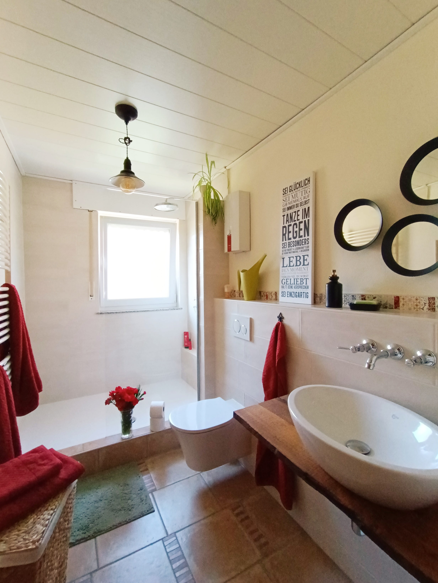 Badezimmer mit Dusche. Handtücher und Bettwäsche werden bereitgestellt. Auch die Möglichkeit zum Grillen besteht.
