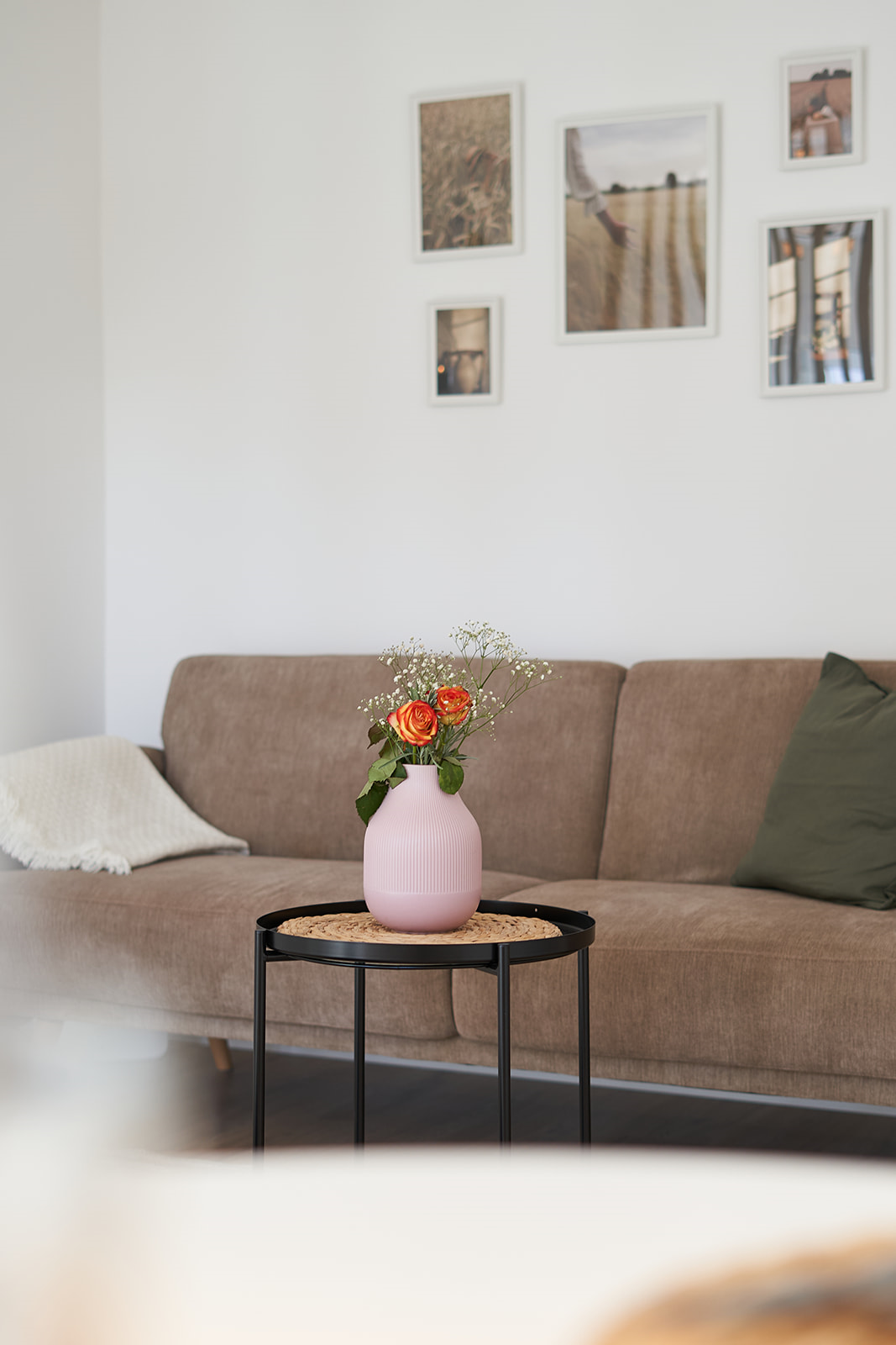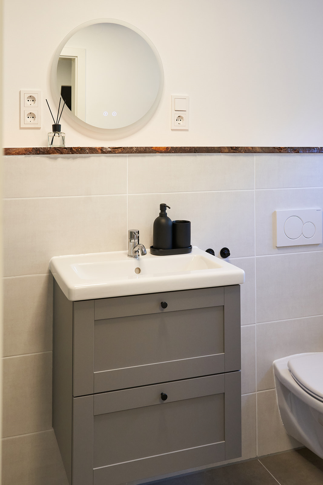 Die im Erdgeschoss liegende Wohnung besteht aus einem Schlafzimmer, einer Küche, einem Bad und einem Wohn- und Essbereich.
