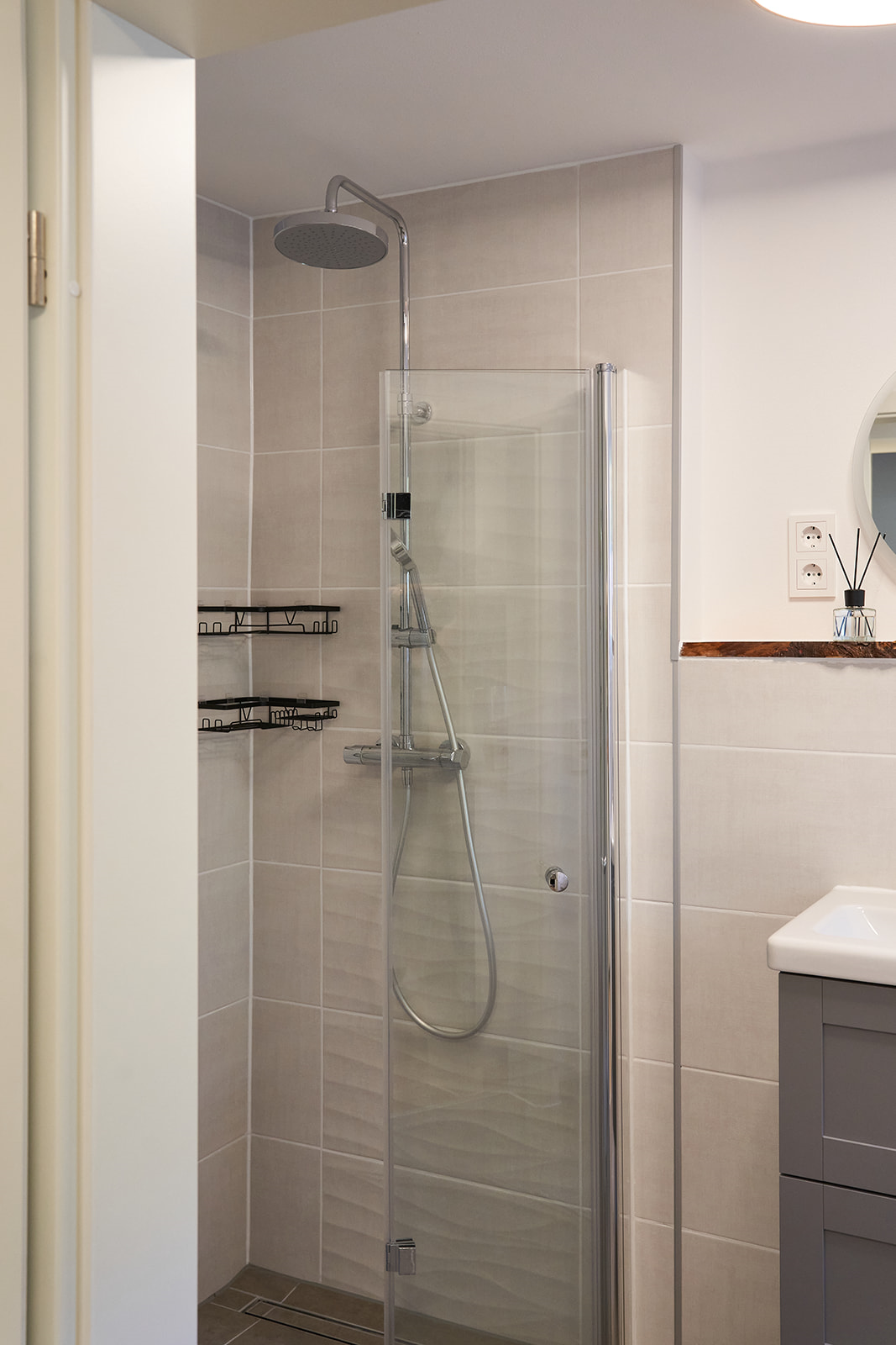 Das Bad verfügt über eine ebenerdige Dusche mit Falttüren, einer Elektroheizung und Staumöglichkeiten, in denen Sie frische Handtücher finden.
