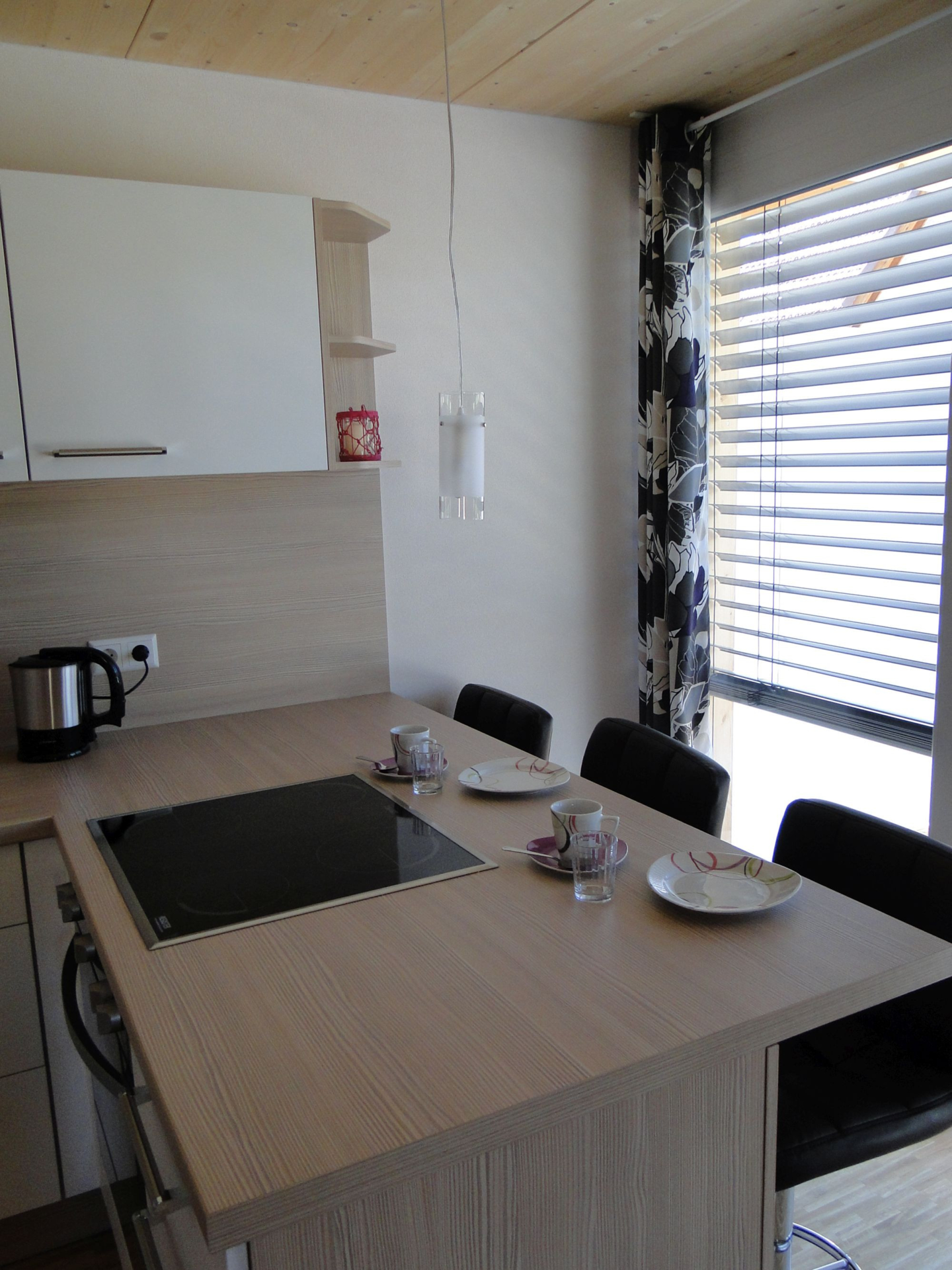 - Küche mit Esstheke, Kühlschrank, Backofen, Spülmaschine, Kaffeemaschine, Wasserkocher