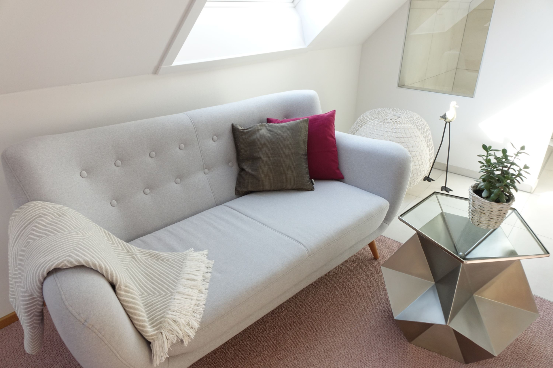 Sitzecke mit weißer Couch, rot und grauem Kissen und eine weiße Decke. Davor steht ein kleiner Tisch mit Topfpflanze. | © Neckar-Zaber-Tourismus e.V.