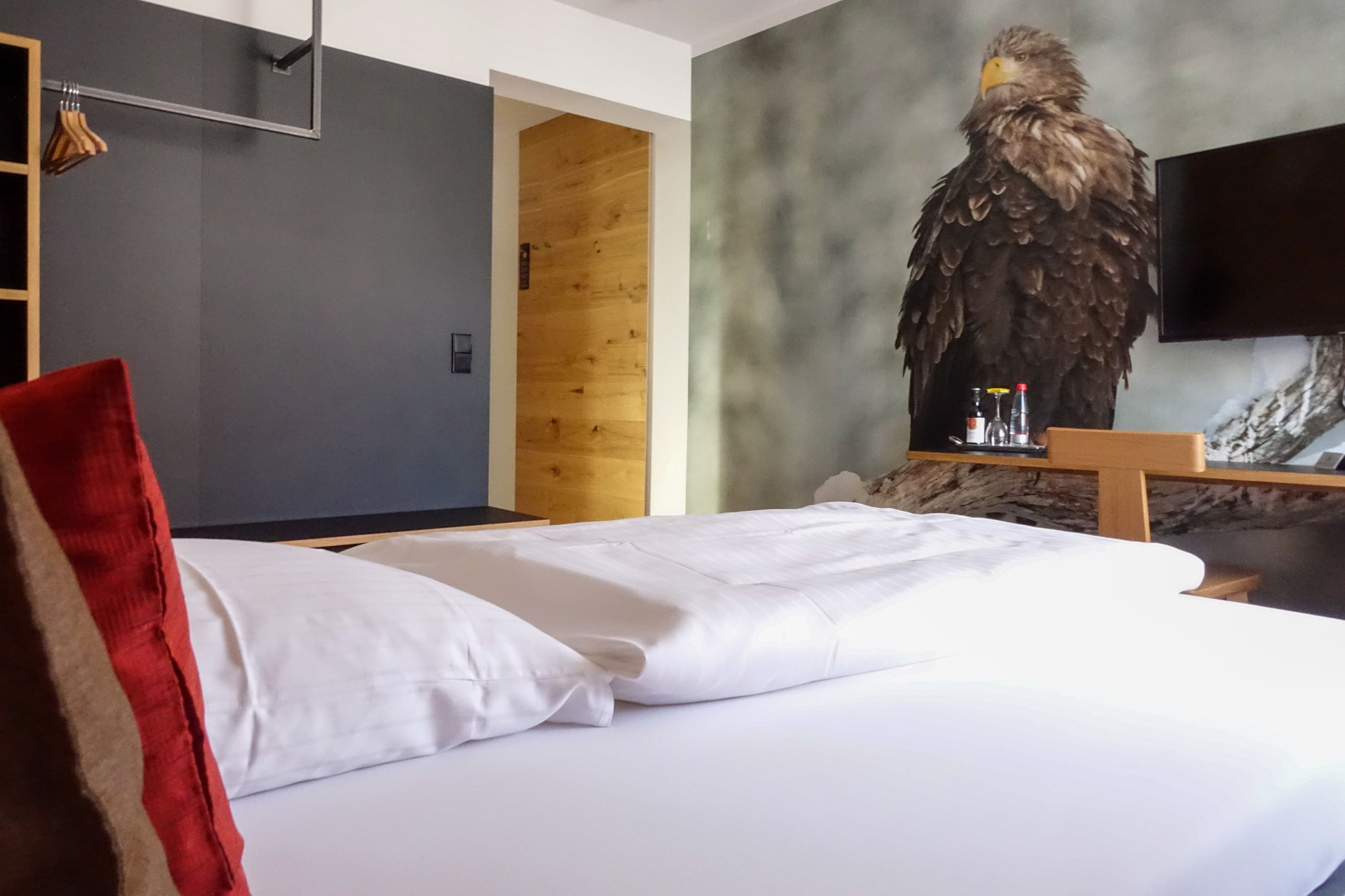 Aufnahme eines Zimmers: weißes Bett und rotes Kissen, gegenüber steht ein Fernseher. Auf dem Bild im Hintergrund ist ein Ader abgebildet. | © Neckar-Zaber-Tourismus e.V.