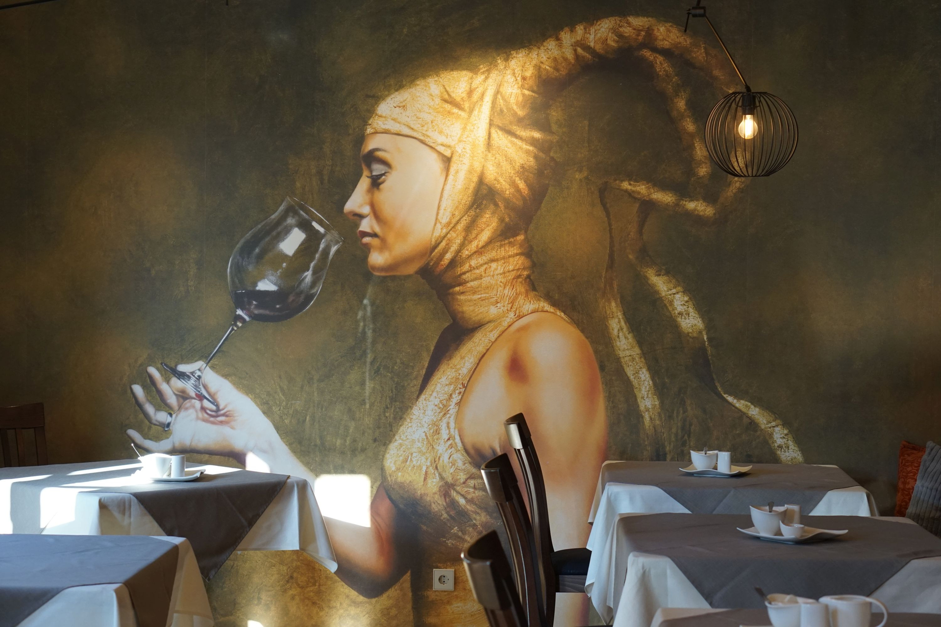 Vergrößerte Aufnahme des Hintergrundbildes im Frühstücksraum. Zu sehen ist eine Frau in gold mit hörnerähnlicher Kopfbedeckung, die ein Glas Wein in der Hand hält. | © Neckar Zaber Tourismus e.V.