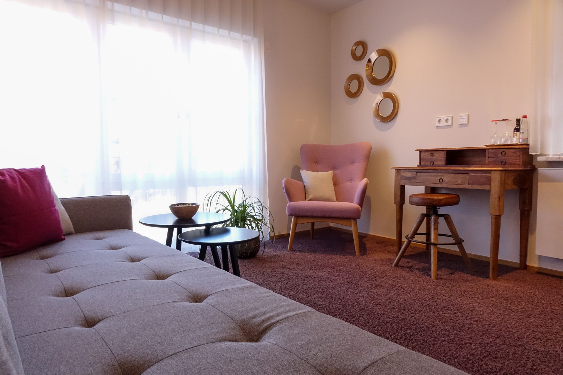 Aufnahme eines Zimmers mit Wohnbereich: graue Couch, zwei kleine schwarze Tische, ein rosa Sesselstuhl und ein hölzerner Schreitisch. Roter Teppichboden. | © Neckar-Zaber-Tourismus e.V.