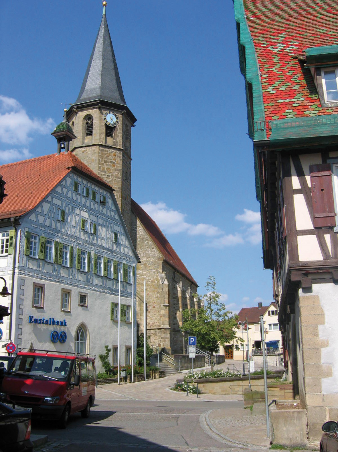 Auf der Raiffeisenstraße verlassen wir den Ort. Nach rund 2 km (ansteigend) überqueren wir die Straße Hochdorf–Eberdingen (K 1687) und wandern auf der Südseite des Hohscheids am Wald entlang. An dessen Ende halten wir uns links und biegen bei der nächsten Gelegenheit nach rechts zur Straße Hochdorf–Heimerdingen (K 1653) ab. Ihr folgen wir nach Hochdorf und erreichen, über die am Ortseingang abgehende Theodor-Heuss-Straße, danach über die Mörikestraße und Pfarrgasse, die Ortsmitte.