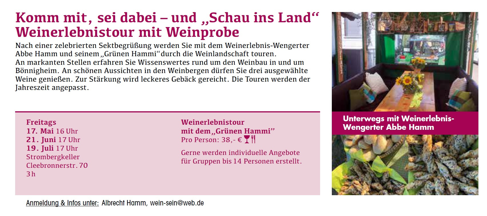 Nach einer zelebrierten Sektbegrüßung werden Sie mit dem Weinerlebnis-Wengerter Abbe Hamm über Stock und Stein durch die Weinberge wandern. An markanten Stellen erhalten Sie Wissenswertes rund um den Weinbau in und um Bönnigheim.