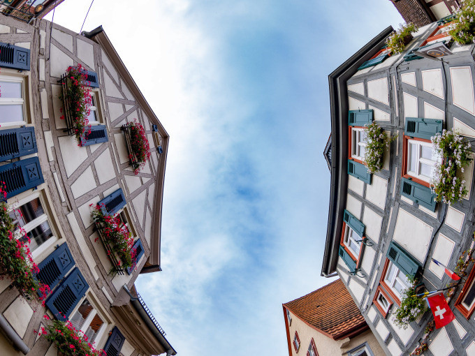 Fischaugenansicht von Fachwerkhäusern mit blauen Fensterläden und Blumenkästen in Besigheim. | © Stadt Besigheim