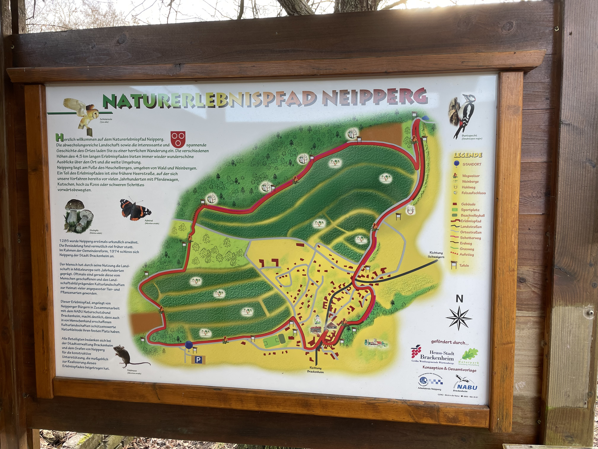 Die abwechslungsreiche landschaft sowie die interessante und spannende Geschichte des Ortes laden zu einer herrlichen Wanderung ein. Die verscihedenen Höhen des 4,5 km langen Erlebnispfades bieten immer wieder underschön Ausblicke über den Ort unddie weite Umgebung. Neipperg liegt am Fuße des Heuchelberges, umgeben von Wal und Weinbergen. Ein Teil des Erlebnispfades ist eine frühere Heerstraße, auf der sich Kutschen, hoch zu Ross oder schweren Schritts vorwärtsbewegten. Ausblicke über das Zabergäu und auf die Burg Neipperg machen den Erlebnispfad sehr lohnenwert. Die spannenden Wege durch Wald und entlang der Weinberge bringen ein echtes Erlebnis für Groß und Klein. Erebnistafeln mit Wissenswerten Informationen und interessanten Quiz-Fragen + Auflösungen bringen extra Spaß und Erlebnis mit sich.
