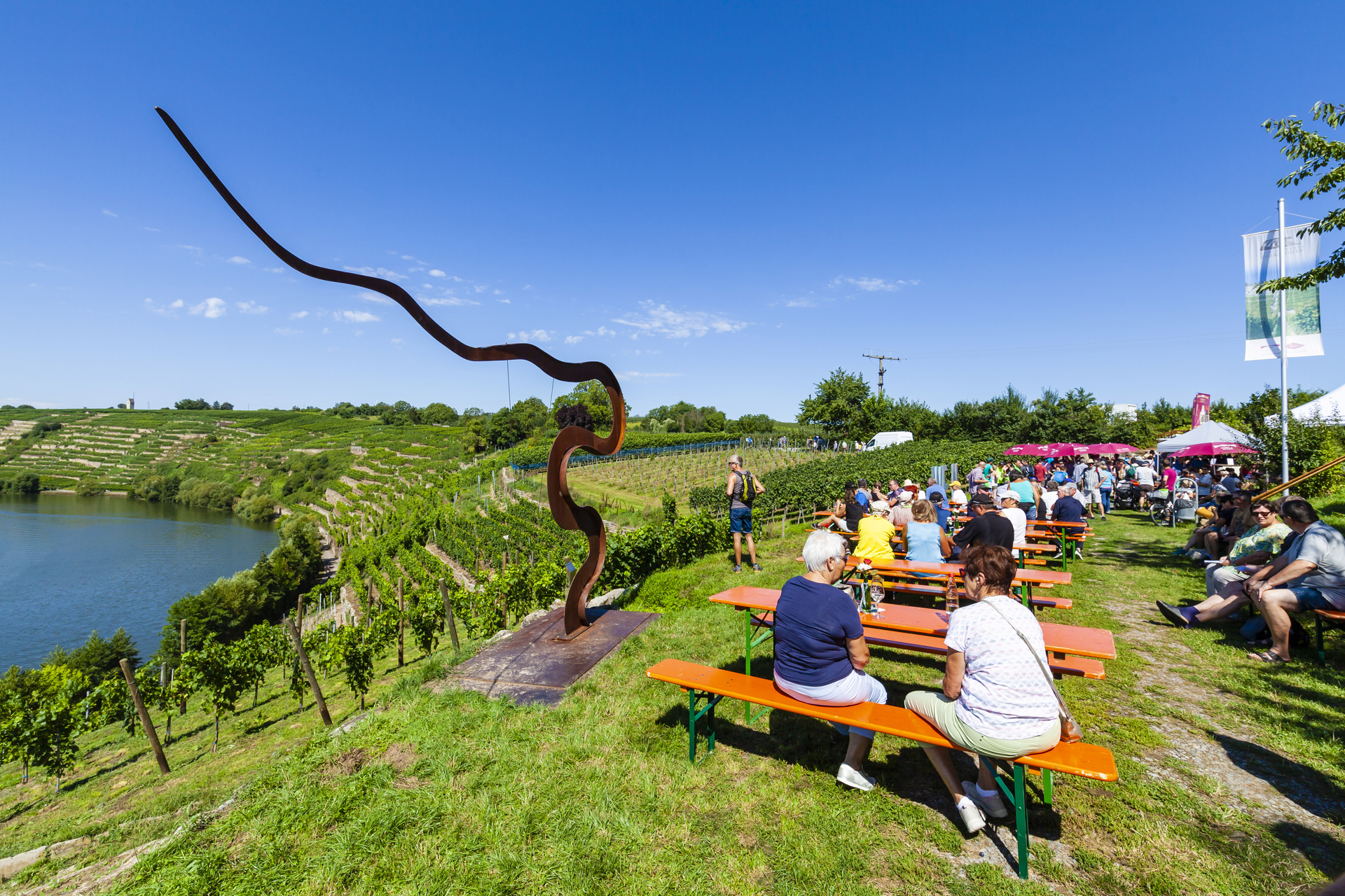 Erlebnisweg durch die Terrassenweinberge von Kirchheim a.N. auf teilweise schmalen, unbefestigten Pfaden und Weinbergstaffeln – entlang der spektakulären Neckarschleife, durch den historischen Ortskern von Kirchheim und am Neckarufer entlang.