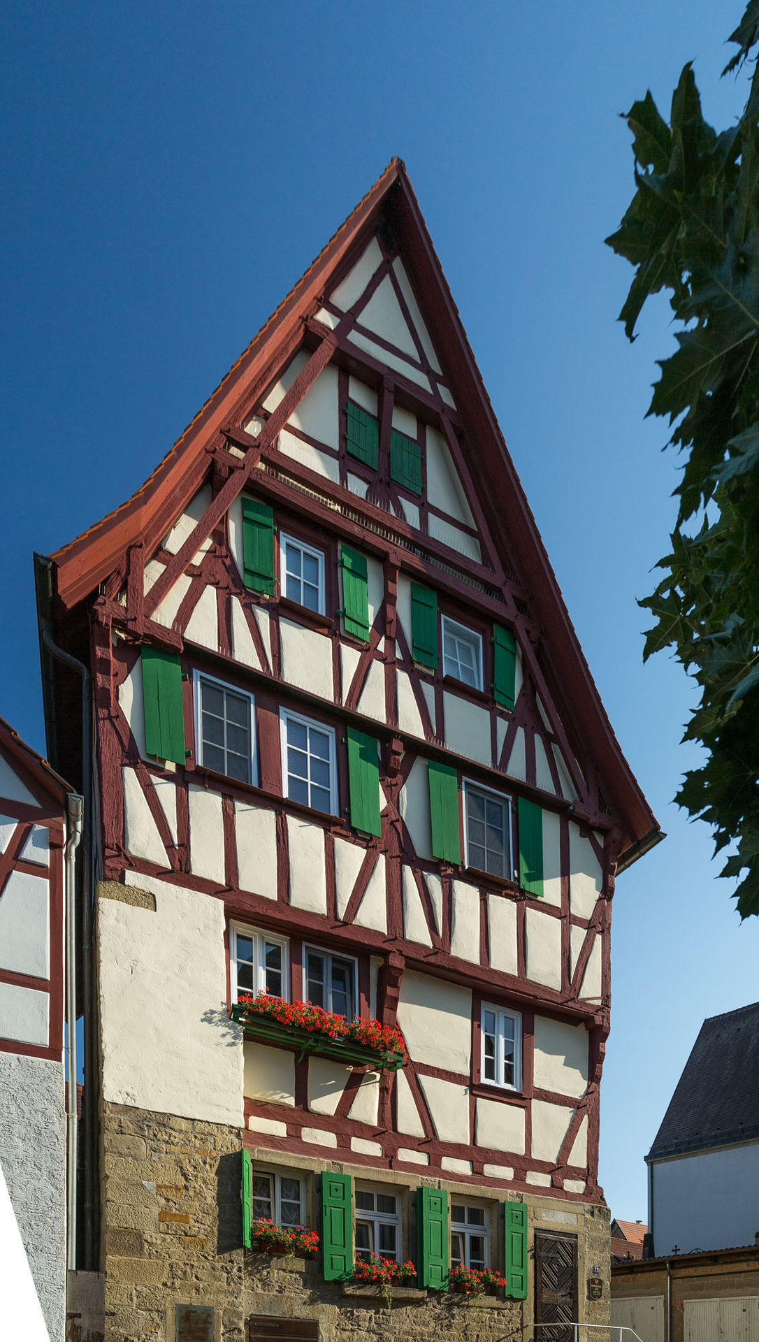 Vor diesem ein fein gegliederter Schwebegiebel. Der Schwebegiebel ist an mittelalterlichen Häusern um 1450 in Mosbach nachweisbar. Wie dort sind auch hier sämtliche Hölzer des Dachwerks miteinander verblattet.