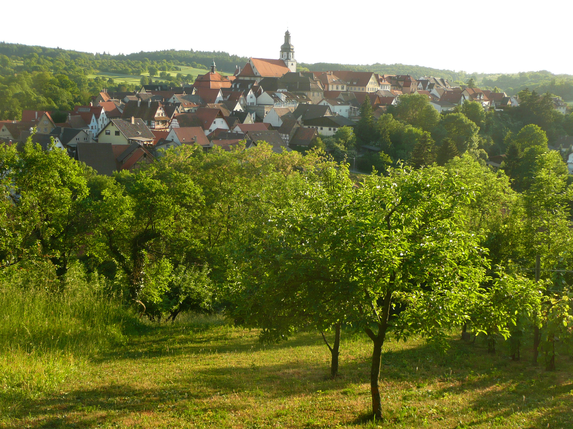 Der schmale Pfad wendet sich nach rechts und schlängelt sich zwischen den Gärten über eine Brücke hinauf zur Ortsstraße, an der wir links ein Stück entlang gehen bis zu den Trocken-mauern unterhalb des Schlosses. Die steile Treppe „Schafraingärten“, für die etwas Kondition erforderlich ist, führt uns über 93 Stufen hinauf zum Schlosshof und zur evangelischen Kirche St. Martin.