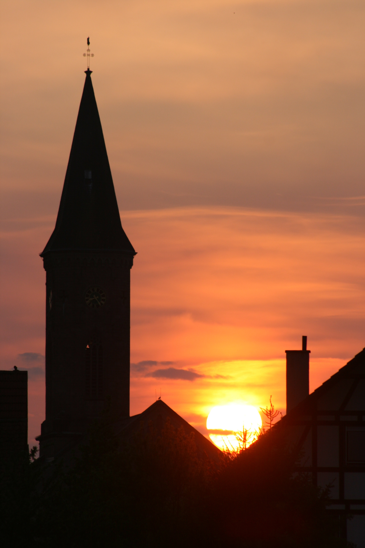 Wieder den Bach entlang wandern wir Richtung Kraichtal-Münzesheim und passieren bei der Brücke links den unbeschrankten Bahnübergang. Nach ein paar Metern rechts durch die Ulmenstraße und über die Brücke links kommen wir zum Rathaus, wo vor uns schon die evangelische St. Martinskirche zu sehen ist. Rechts befinden sich die evangelische Diakoniestation und das Seniorenzentrum Kraichtal. Wir biegen in die Pfarrgasse ein und erreichen die Kirche. Dort an der seitlichen Kirchentür sehen wir eine Darstellung des heiligen Martin bei der Mantelteilung.