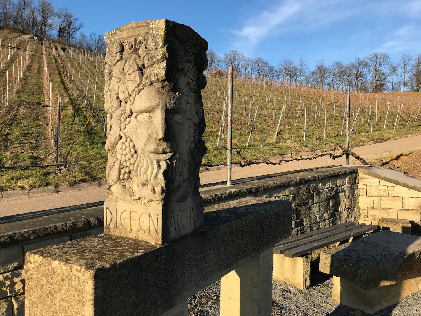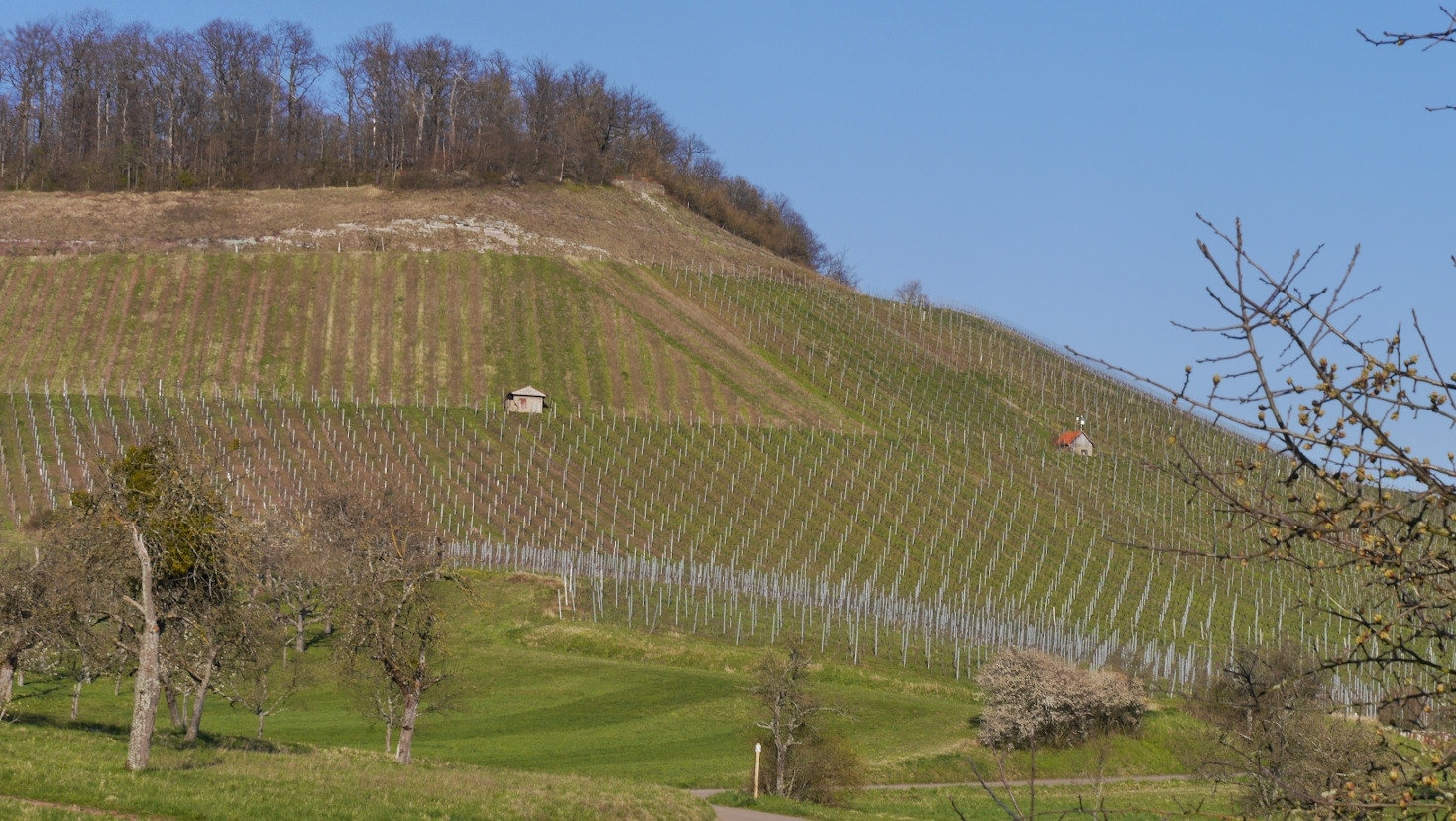 Der Weg führt anfangs ganz sanft aufwärts. Rechts sieht man ein kleines Regenrückhaltebecken am Wegesrand. Nachdem man die Wiesen bzw. den Obstwiesengürtel verlassen hat und in die Weinberge kommt, wird der Weg etwas steiler. Bei dem Rastplatz Diefenbachus weicht man nach links ab und gewinnt in einer weitgezogenen Linkskurve stark an Höhe.