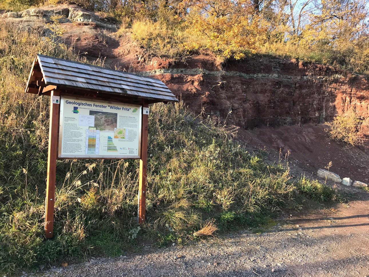 Bei der Abzweigung in den Wald steht die Erläuterungstafel "Geologisches Fenster - Wilder Fritz". Dort ist auch der geologische Aufschluss zu sehen, der einen Ausschnitt aus dem Erdmittelalter zeigt. Zu einer Verschnaufpause lädt das Sandsteinkunstwerk "Wilder Fritz" ein.