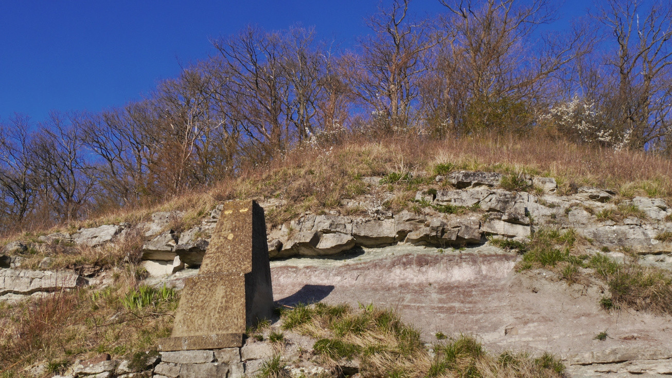 Von nun an geht der Weg mehr oder minder eben in luftiger Höhe weiter. Unten verlaufen die Weinberge und zwischen Weg und Waldrand läuft ein breites Band aus Trocken- bzw. Magerrasen. Dieser Bereich stellt ein wichtiges Biotop für wärmeliebende Tiere und Pflanzen dar. Zahlreiche Schmetterlinge gaukeln im Sommer über die Blüten. Bänder von rotem und dunkelgrauem Rohmergel wechseln sich ab.