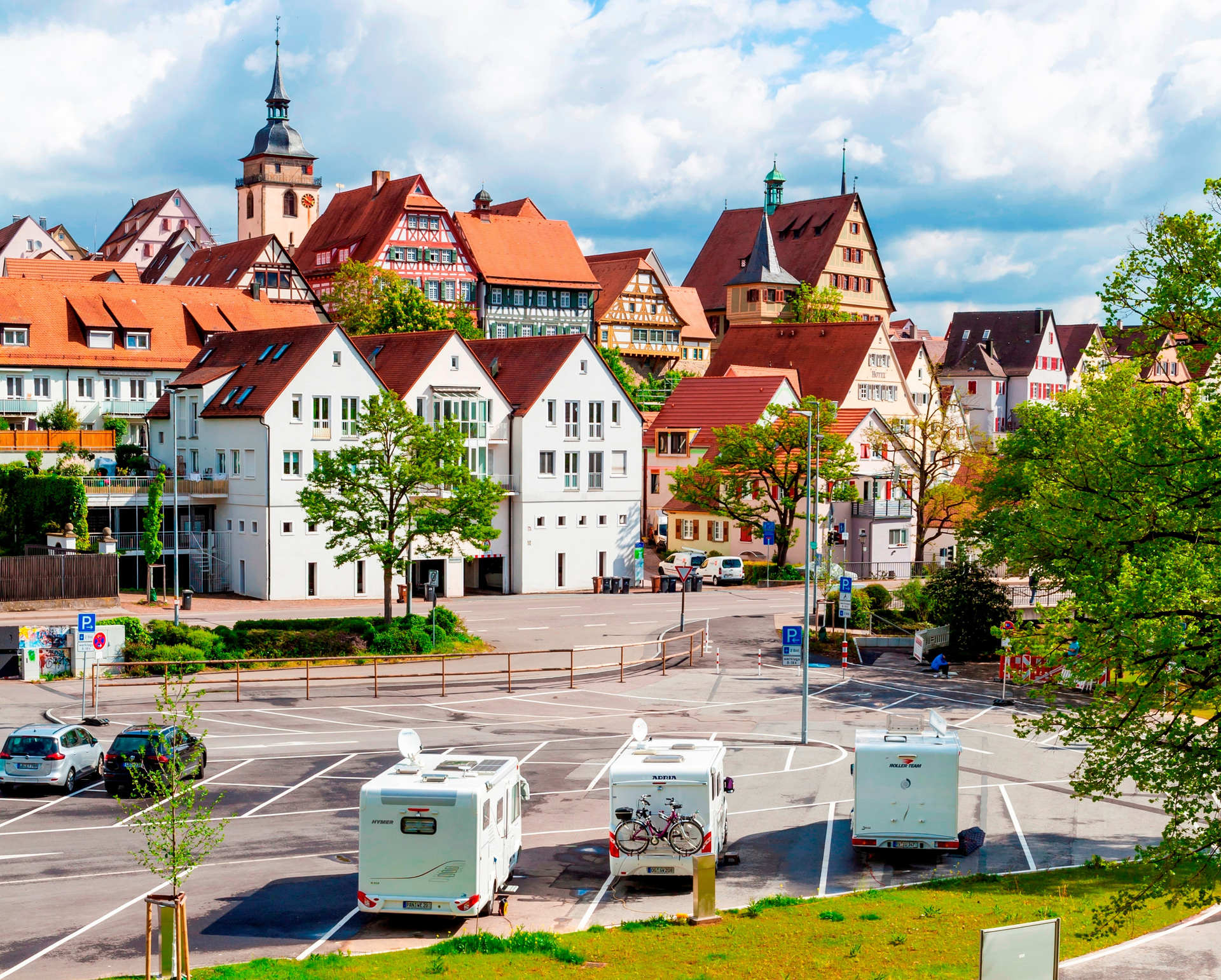Stellplatz mit Fachwerksilhouette im Blick. In der nur wenigen Gehminuten entfernten Altstadt laden viele Restaurants, Weinstuben und Café, Kultureinrichtungen und Einkaufsmöglichkeiten zum Bummeln und verweilen ein. Das Enztal und die nahen Weinberge eignen sich für Rad- und Wandertouren.