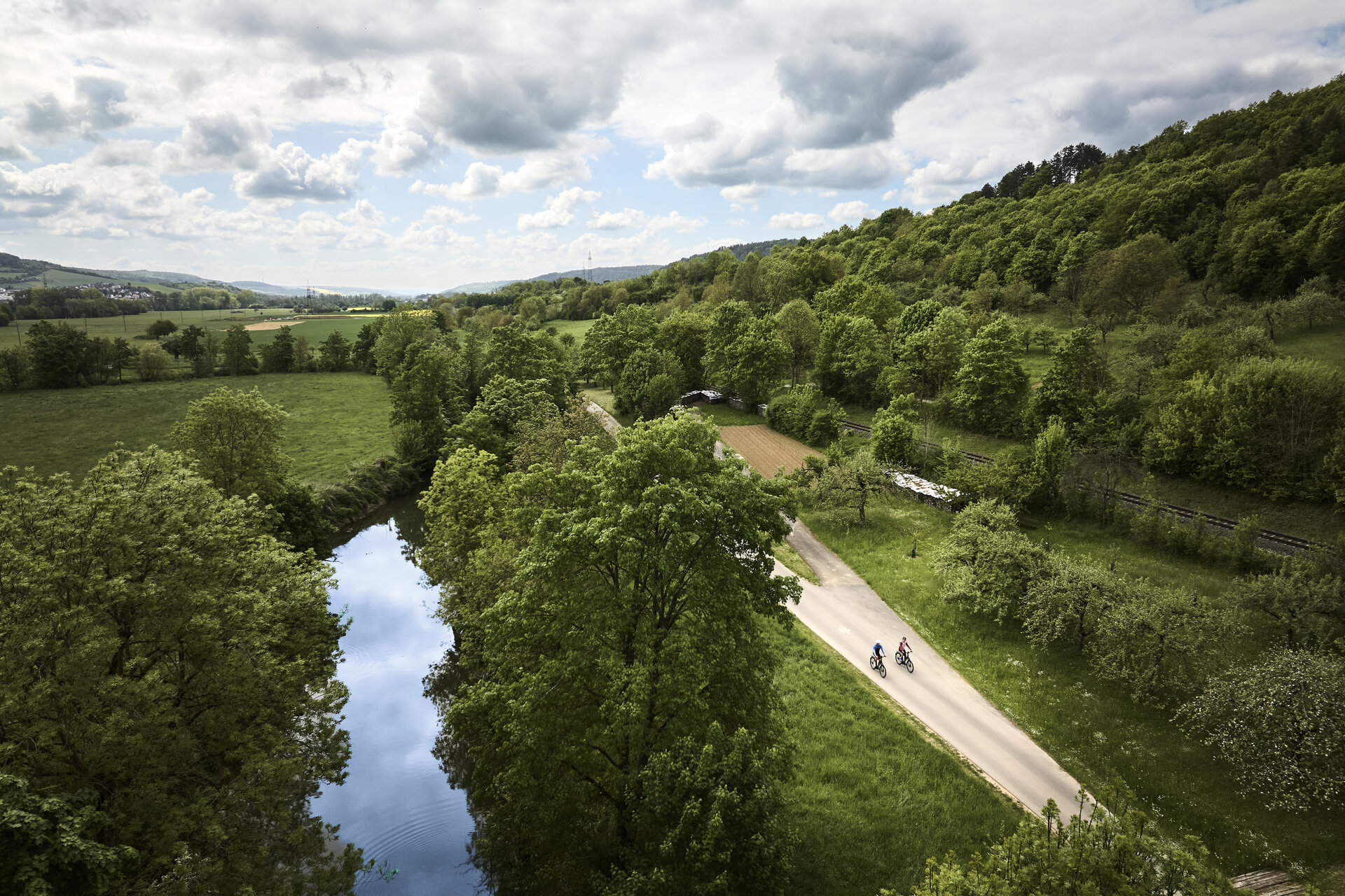 Die Tauber ist der ordnende Mittelpunkt der Region. Sie formt das Tal, verbindet Orte und schafft Übergänge zwischen Auen, Weinlagen und Siedlungen. Ihr gleichmäßiger Verlauf gibt der Landschaft einen ruhigen Rhythmus, der sich auch im Erleben widerspiegelt.