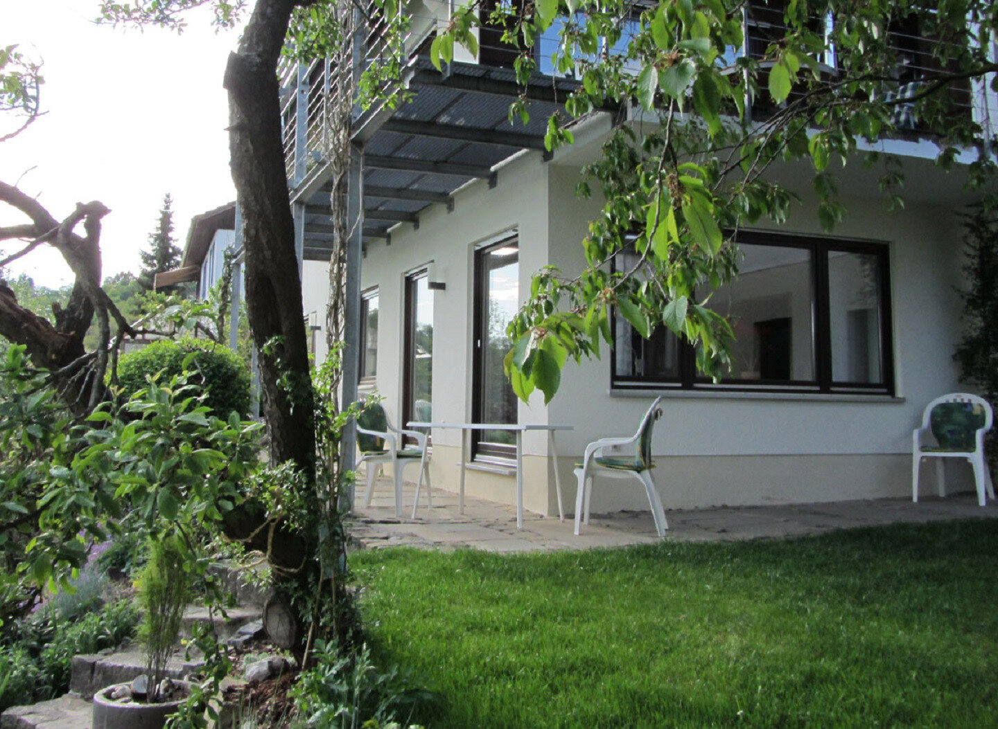 Genieße von der teilweise überdachten Terrasse und dem Garten den weiten Blick in das Kochertal. Hier kannst du gemütlich in der Morgensonne frühstücken oder den Tag in der Abendsonne ausklingen lassen.