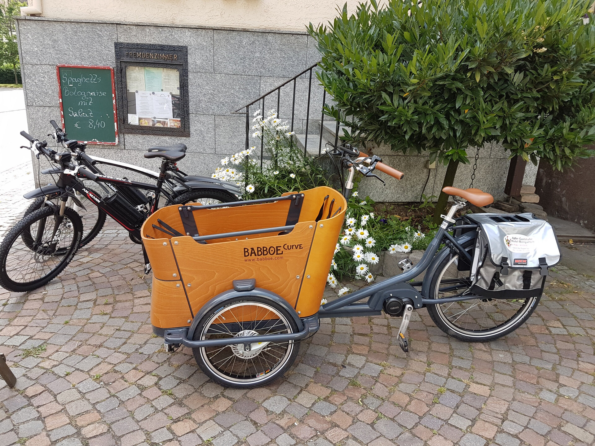 Es stehen 13 E-Bikes zur Verfügung. Darunter auch ein Babboe Curve-Lastenrad, in dem bis zu 4 Kinder sicher und bequem mitfahren.