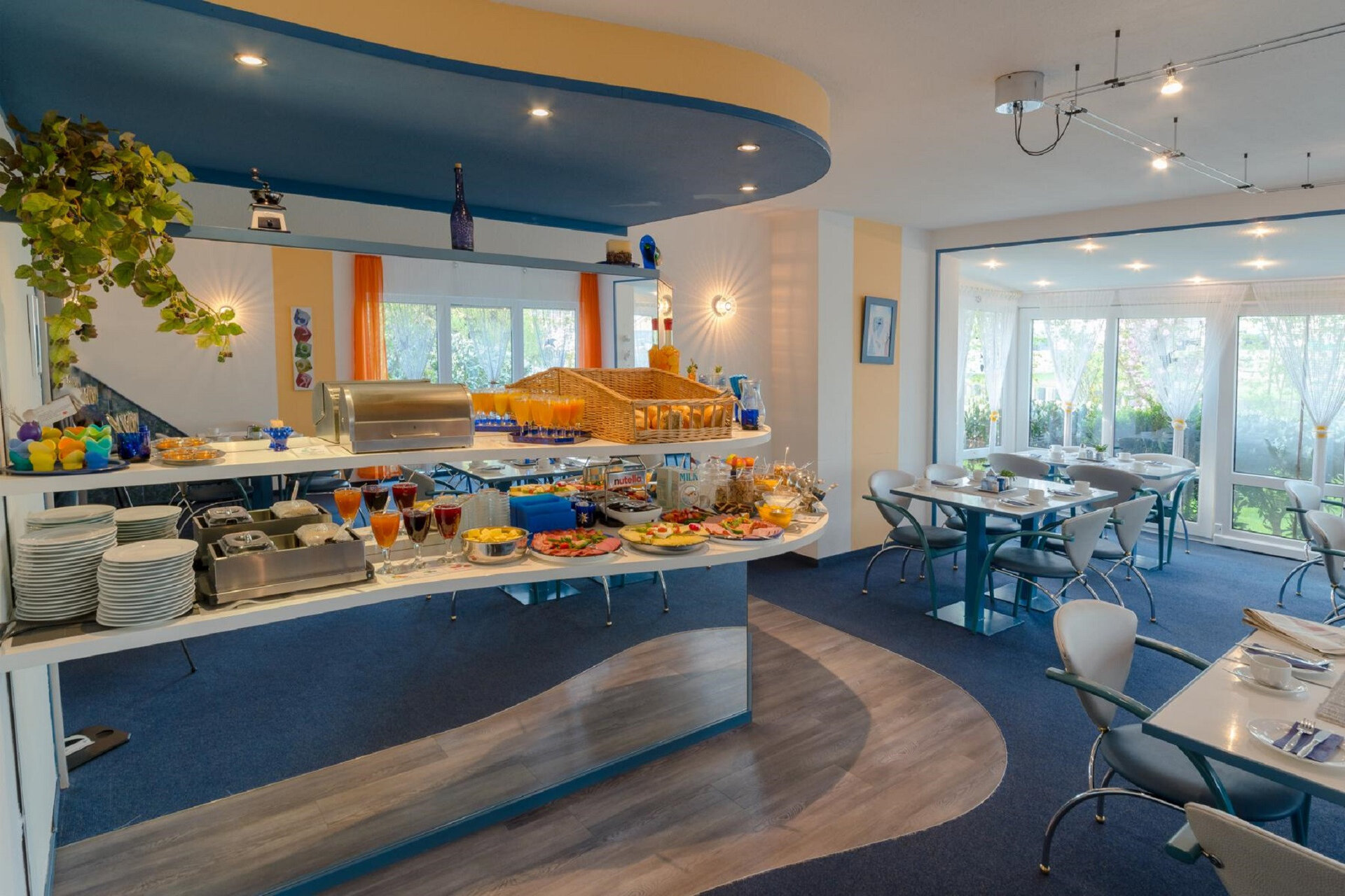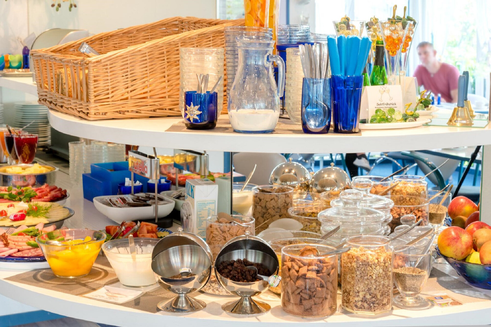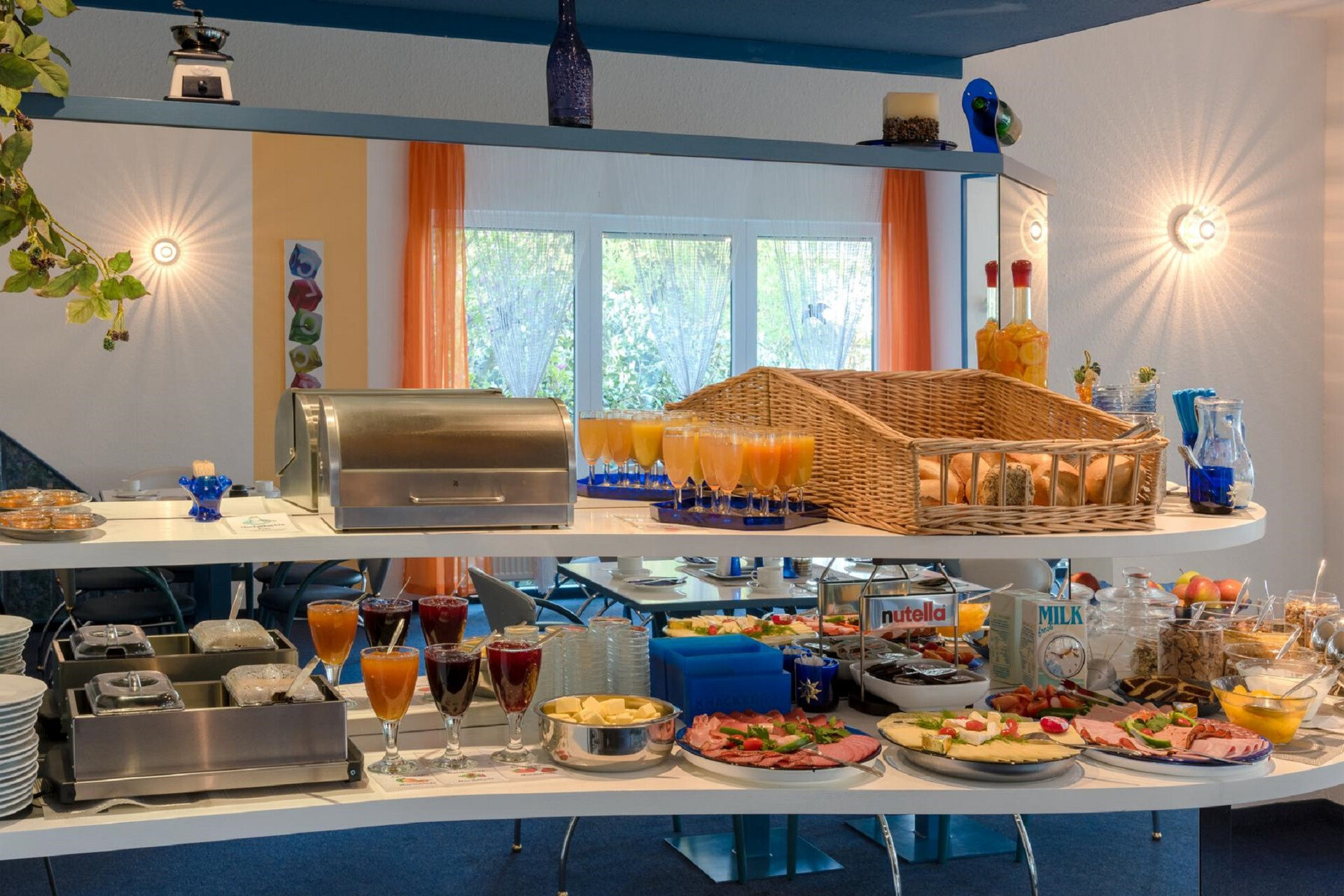 Der Morgen beginnt mit einem liebevoll angerichteten verpackungsfreien Frühstücksbuffet im sonnigen Frühstücksraum mit Blick ins Grüne.