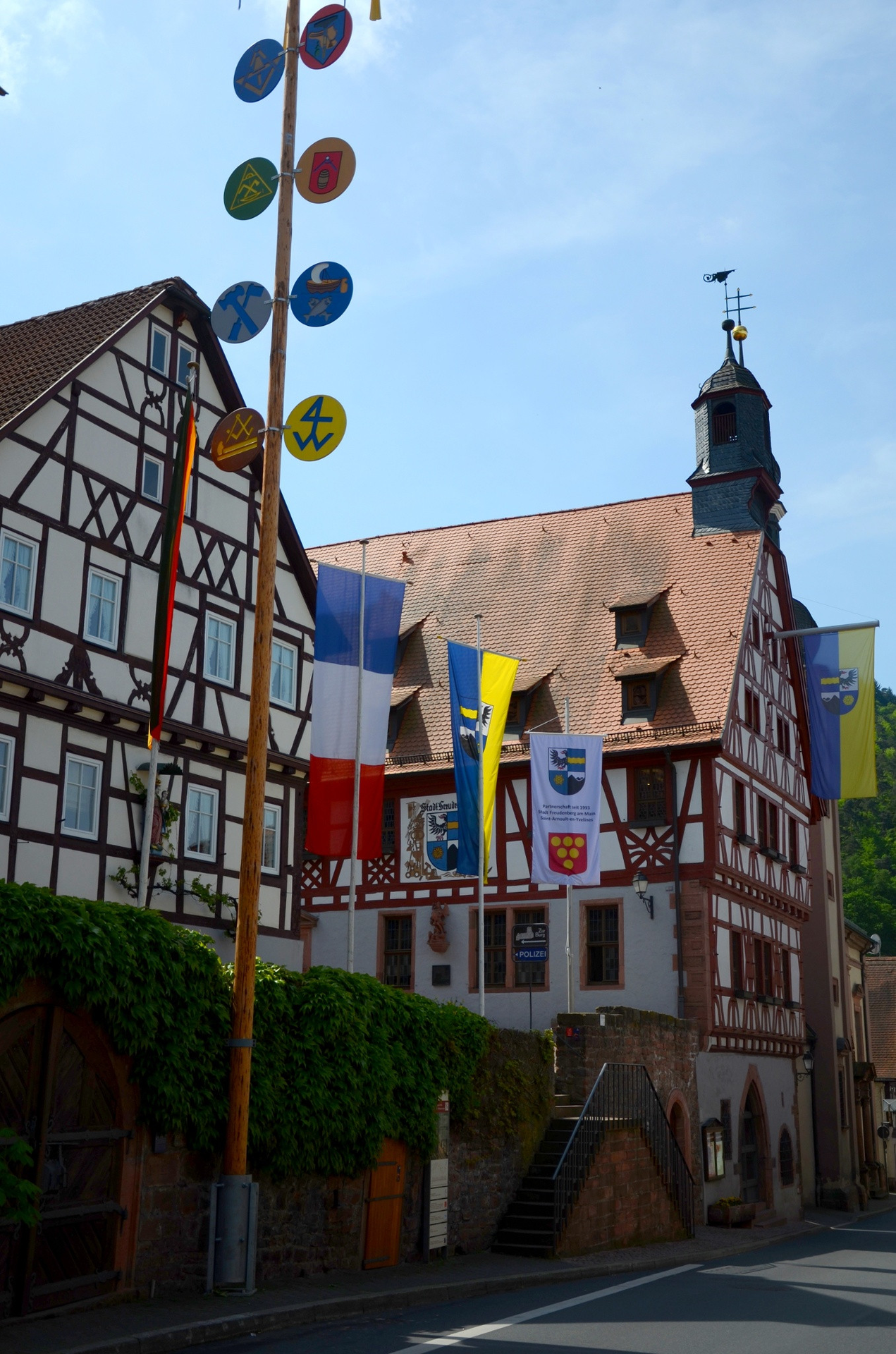 Blick auf das im Fachwerkstil errichtete Rathaus in Freudenberg. Im Vordergrund sind viele Fahnen zu sehen. | © Liebliches Taubertal