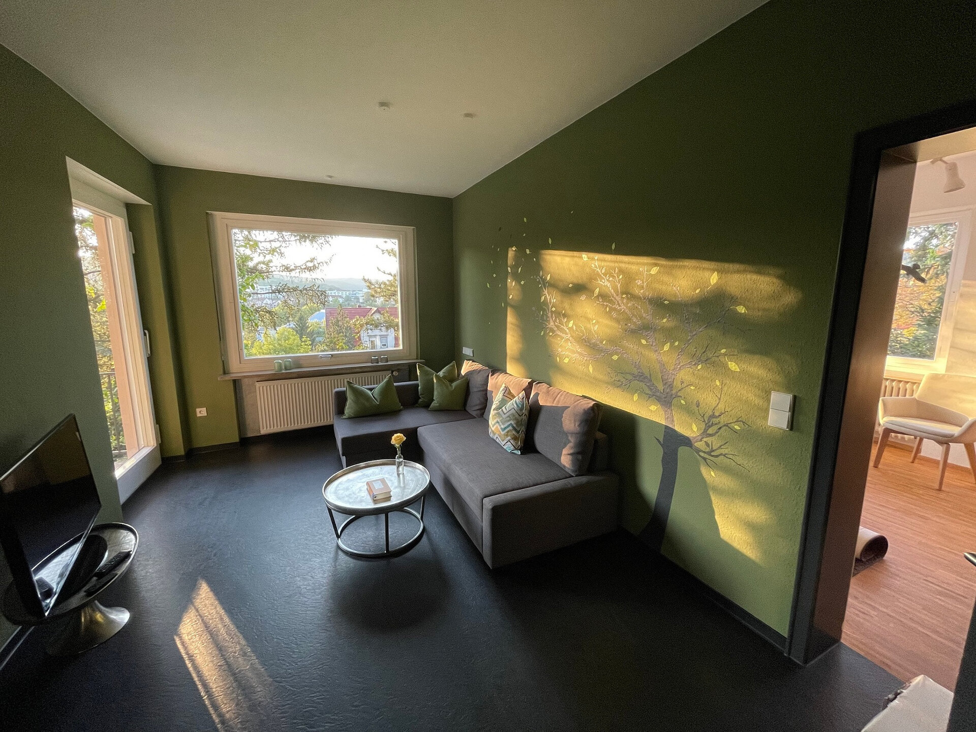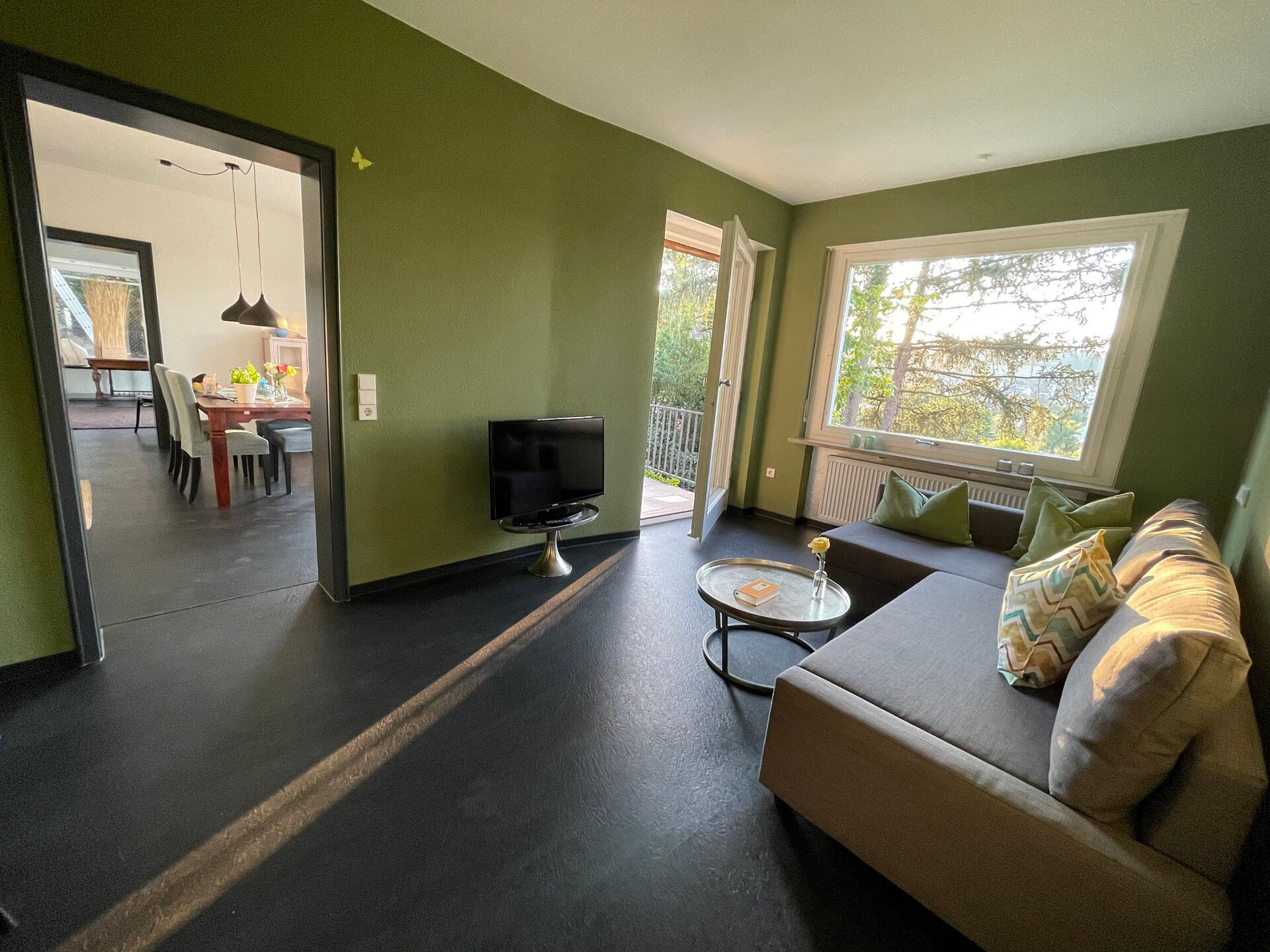 - helles Wohnzimmer mit Blcik in die Natur: große Couch, ein TV