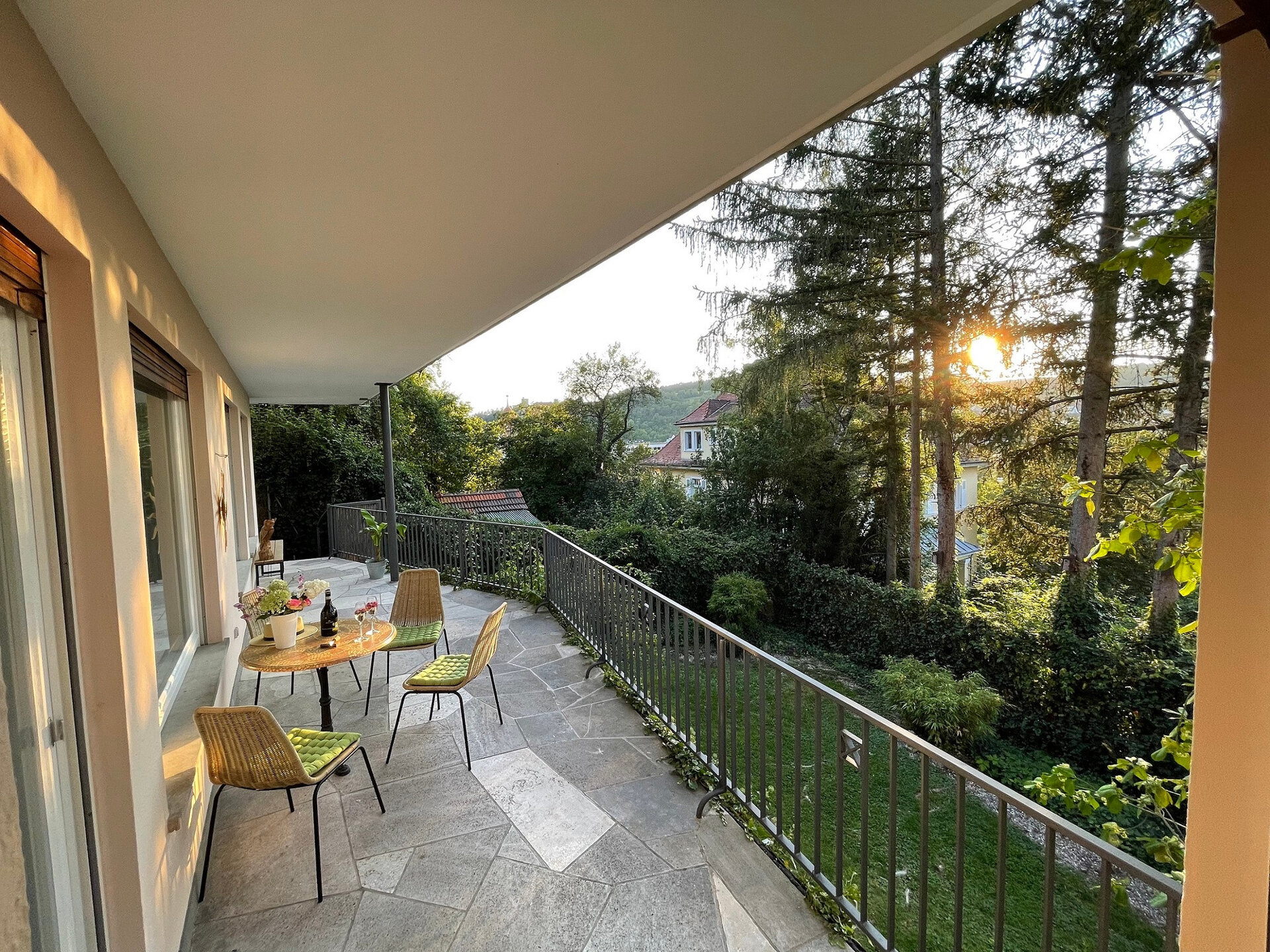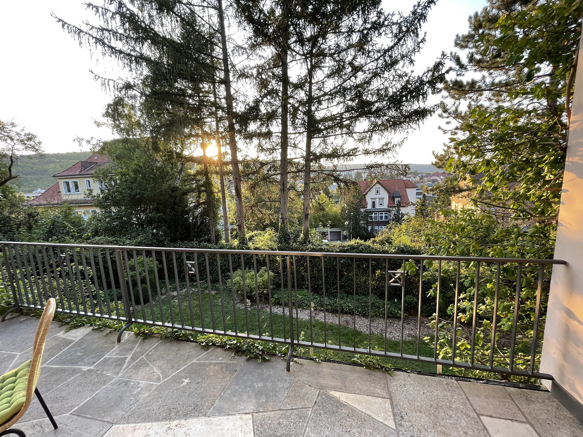 - Esszimmer mit einem direkten Zugang zur sonnigen Terrasse mit Blick auf Bad Mergentheim