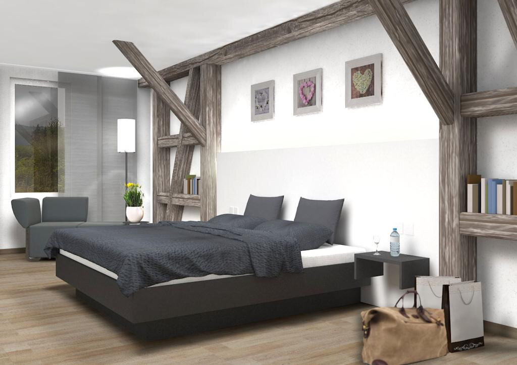 Komfort. Doppelzimmer (über 30qm), TV, Schreibtisch, W-LAN, modernes Bad begehbare Dusche, Fußbodenheizung. Lage: Stadtmitte.