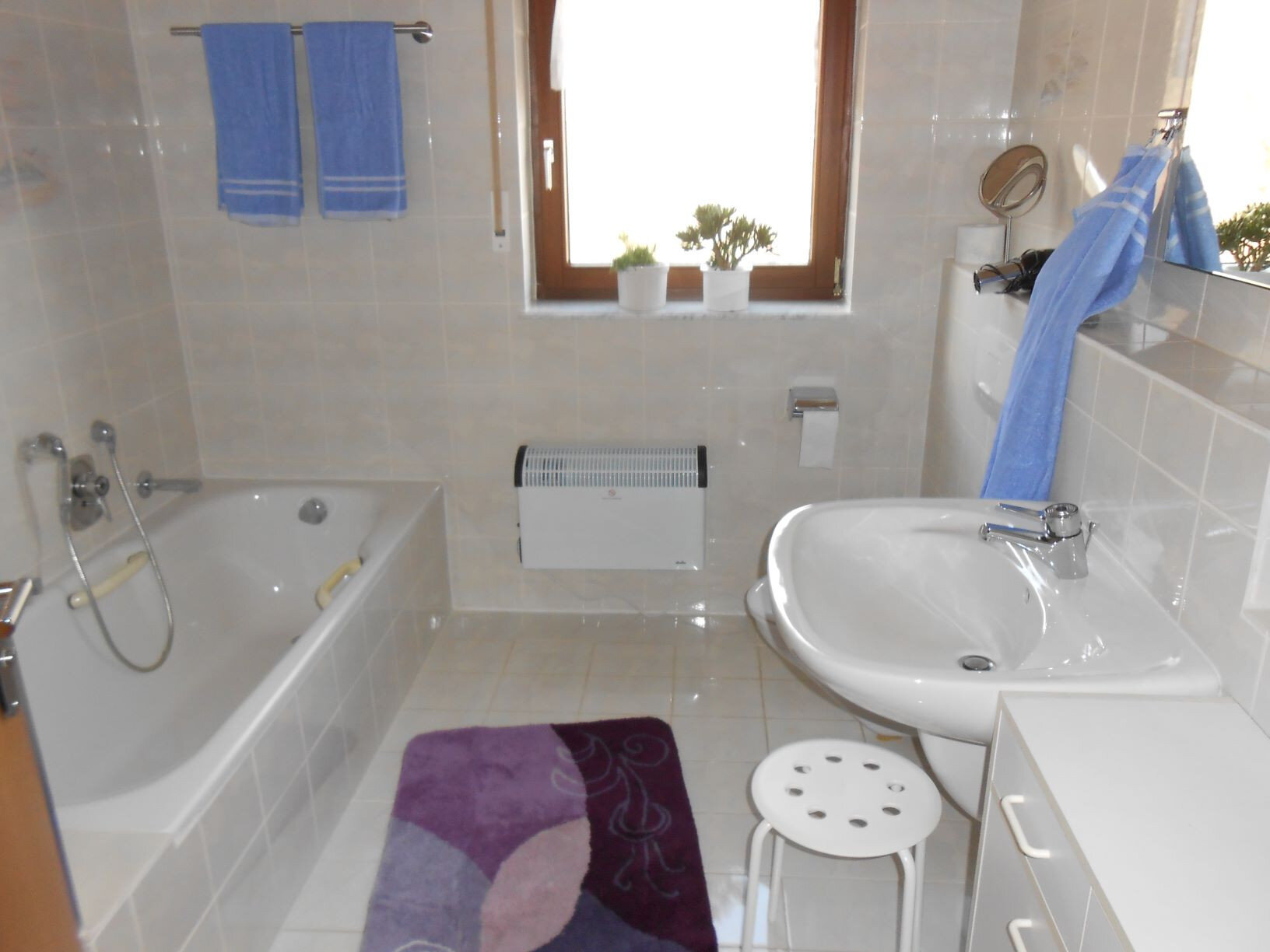 Bad mit Badewanne, Dusche und WC, zusätzlich separates Gäste-WC im Treppenhaus.
