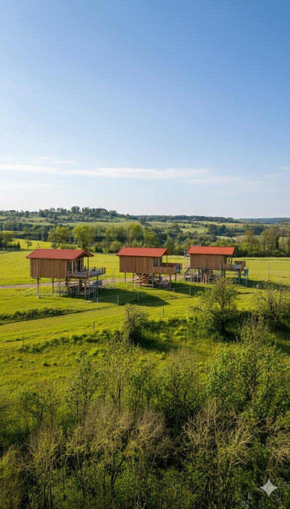 Sky Chalets ist ein exklusives Baumhaushotel-Konzept mit mehreren stilvoll gestalteten Chalets („Neptun“, „Uranus“, „Saturn“ etc.) – jeweils komfortabel ausgestattet auf etwa ~30 m² mit Schlaf- und Wohnbereich, eigener Küchenzeile, Wellness-Bad und großem Balkon mit Panorama-Aussicht. Die Chalets verfügen über besondere Extras wie Outdoor-Whirlpool, Smart-Home-Technik, Klimaanlage und Gasgrill.