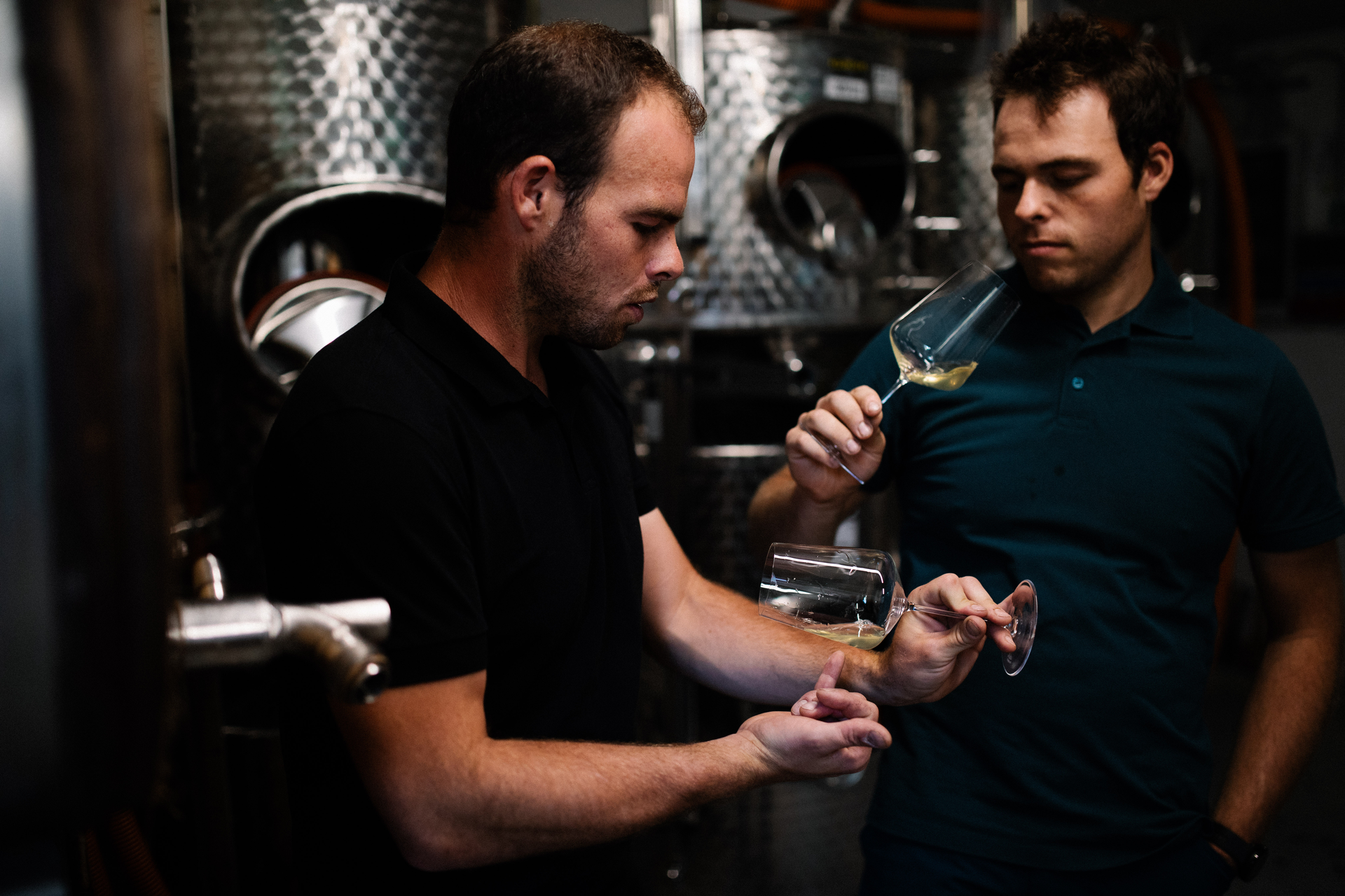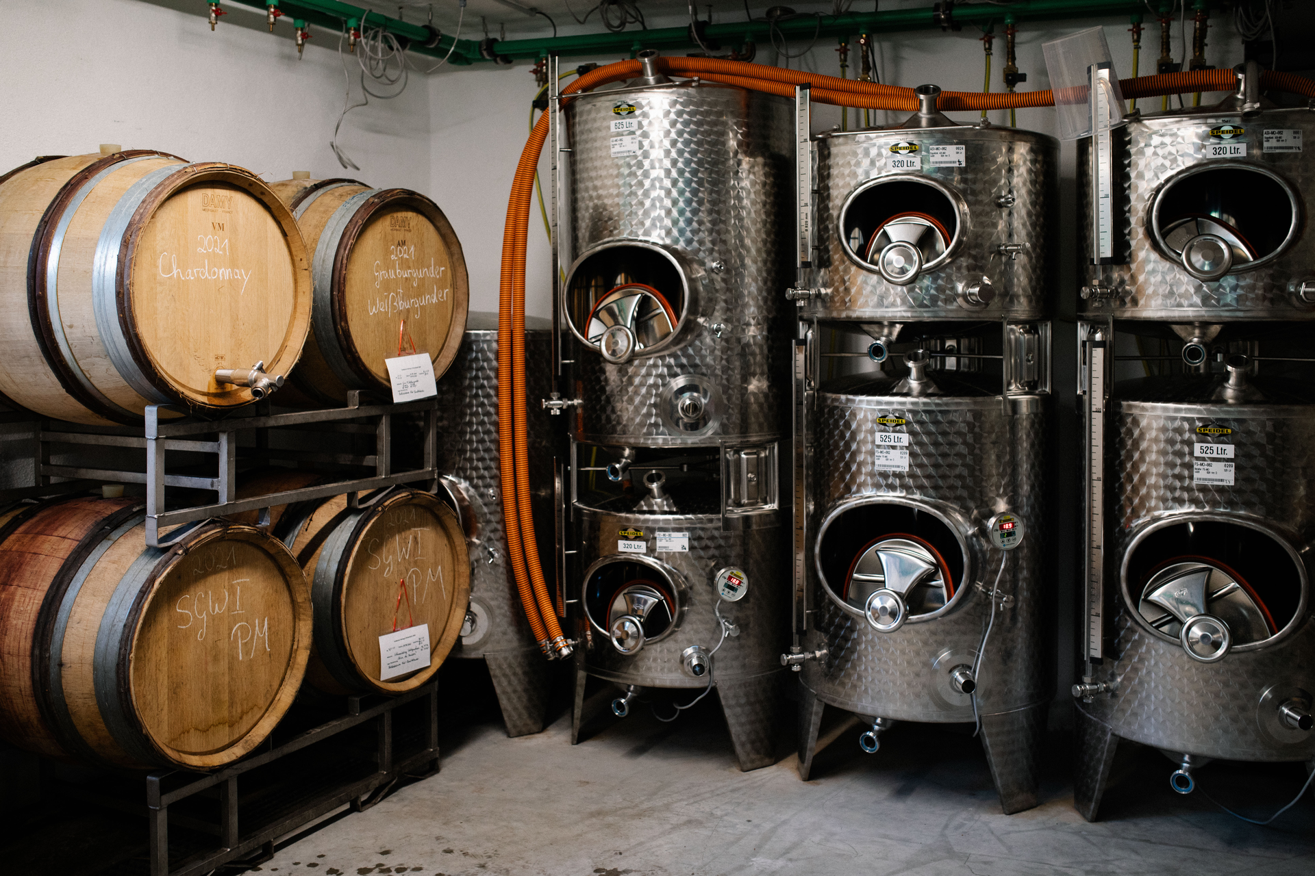 Hier entstehen charaktervolle Weine, die durch Spontangärung und lange Fassreife im Keller ihre unverwechselbare Handschrift erhalten. Besonders der Schwarzriesling, eine Herzensangelegenheit der Brüder, spiegelt die Einzigartigkeit des Terroirs wider. Es werden aber auch Chardonnay, Spätburgunder, Müller-Thurgau und Silvaner angebaut.