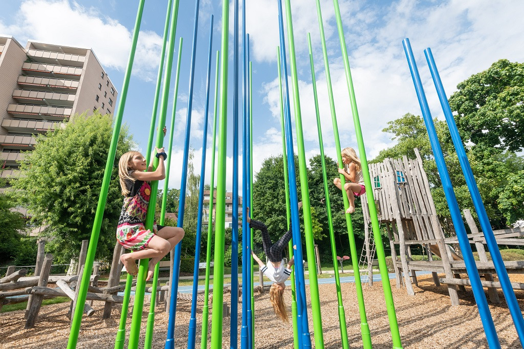Der naturnahe Spiel- und Bewegungsplatz ist für Schulkinder angedacht. Dieser bietet Kindern viel Raum für freies und kreatives Spielen und verbessert nebenbei noch Motorik und Beweglichkeit. Man kann hier Klettern, Hangeln und Balancieren und sich so richtig austoben.